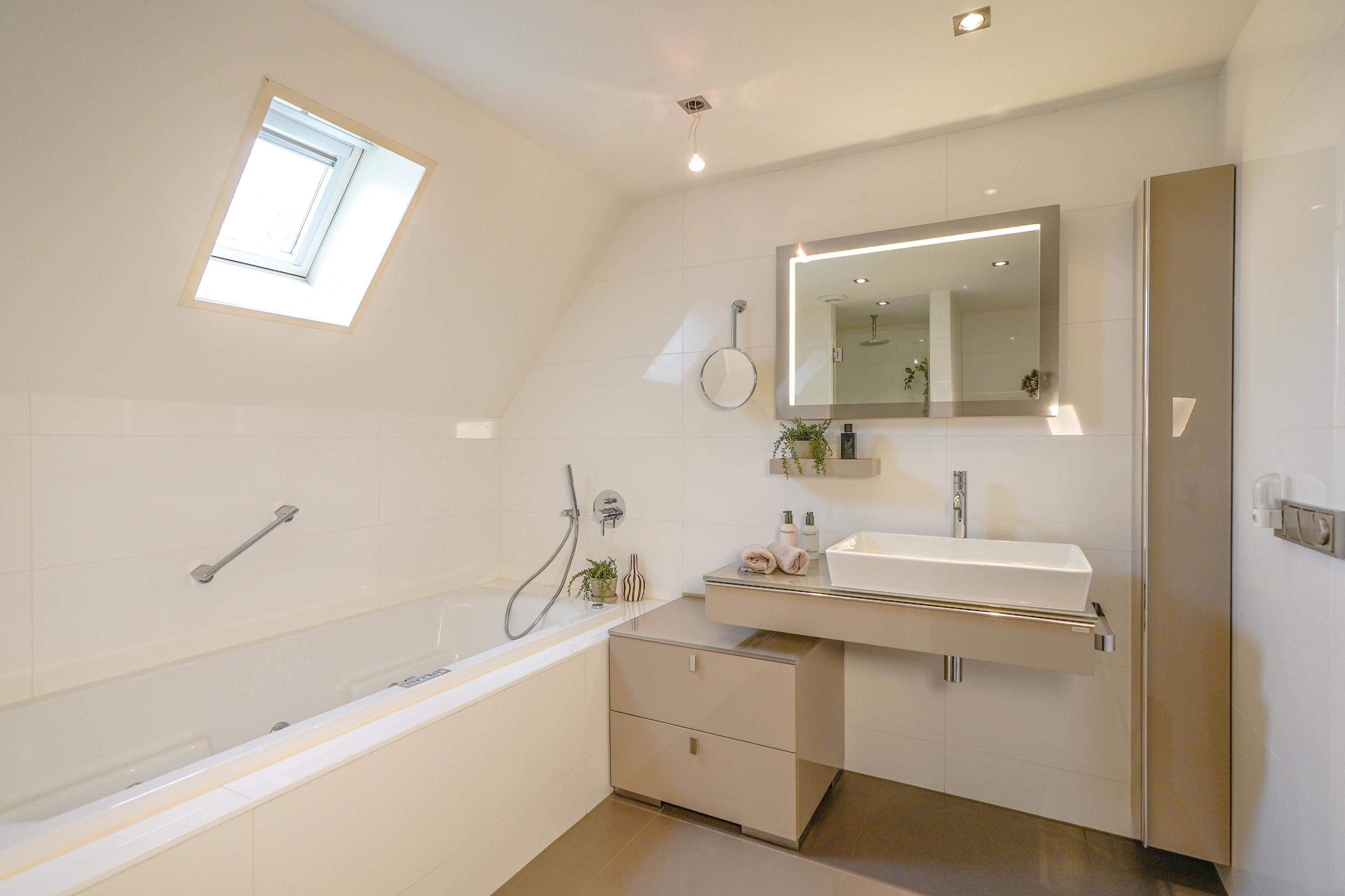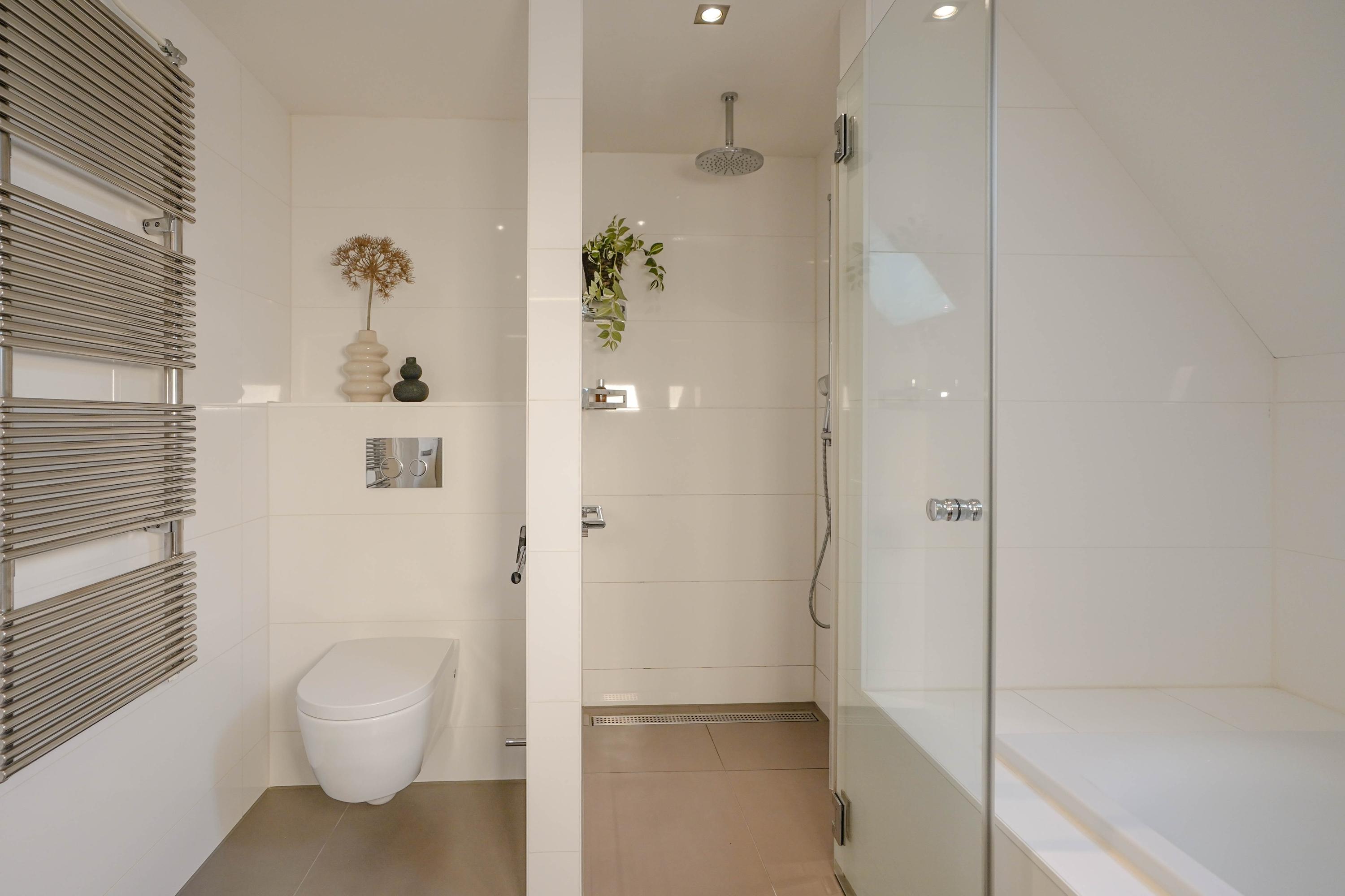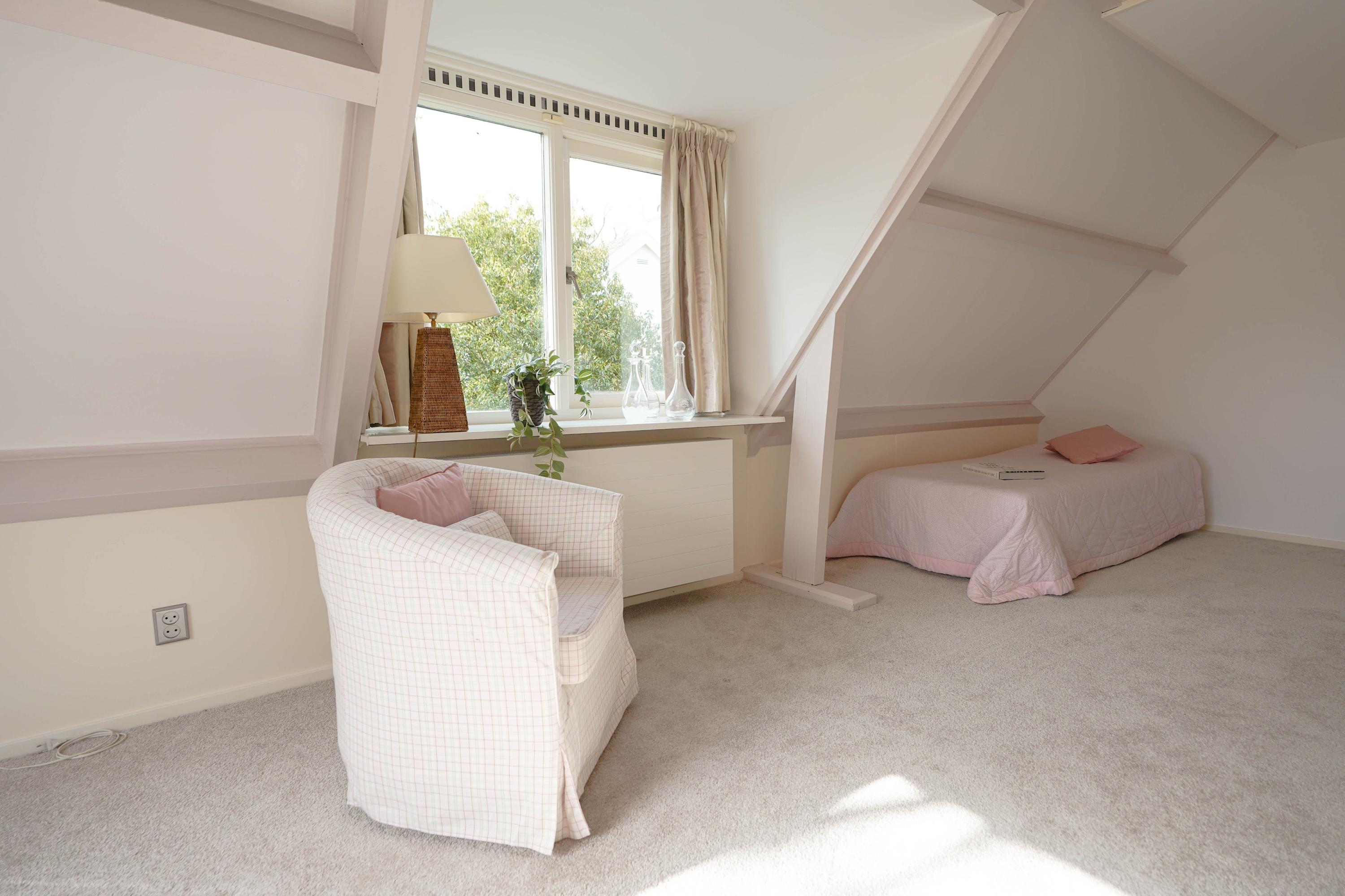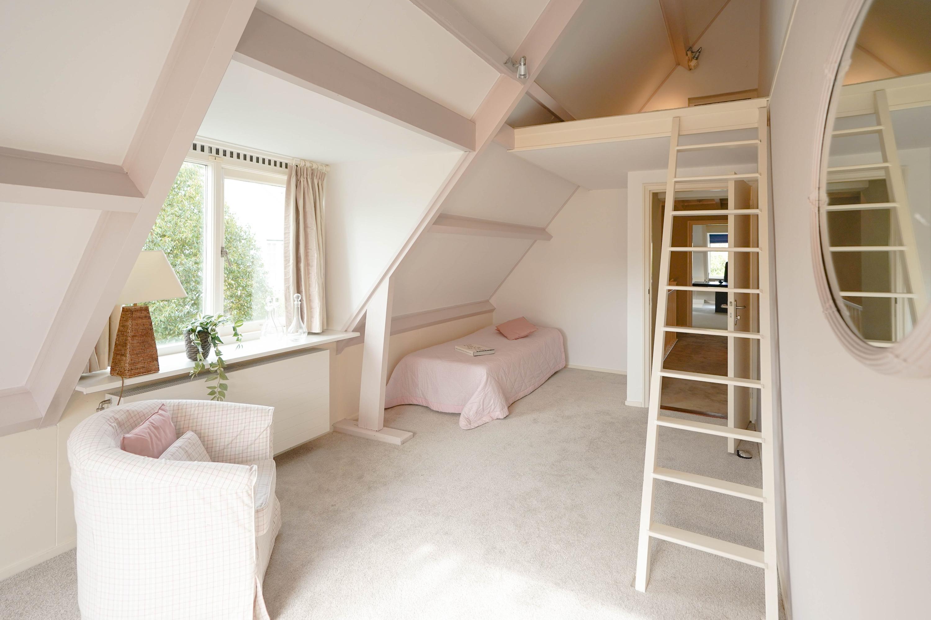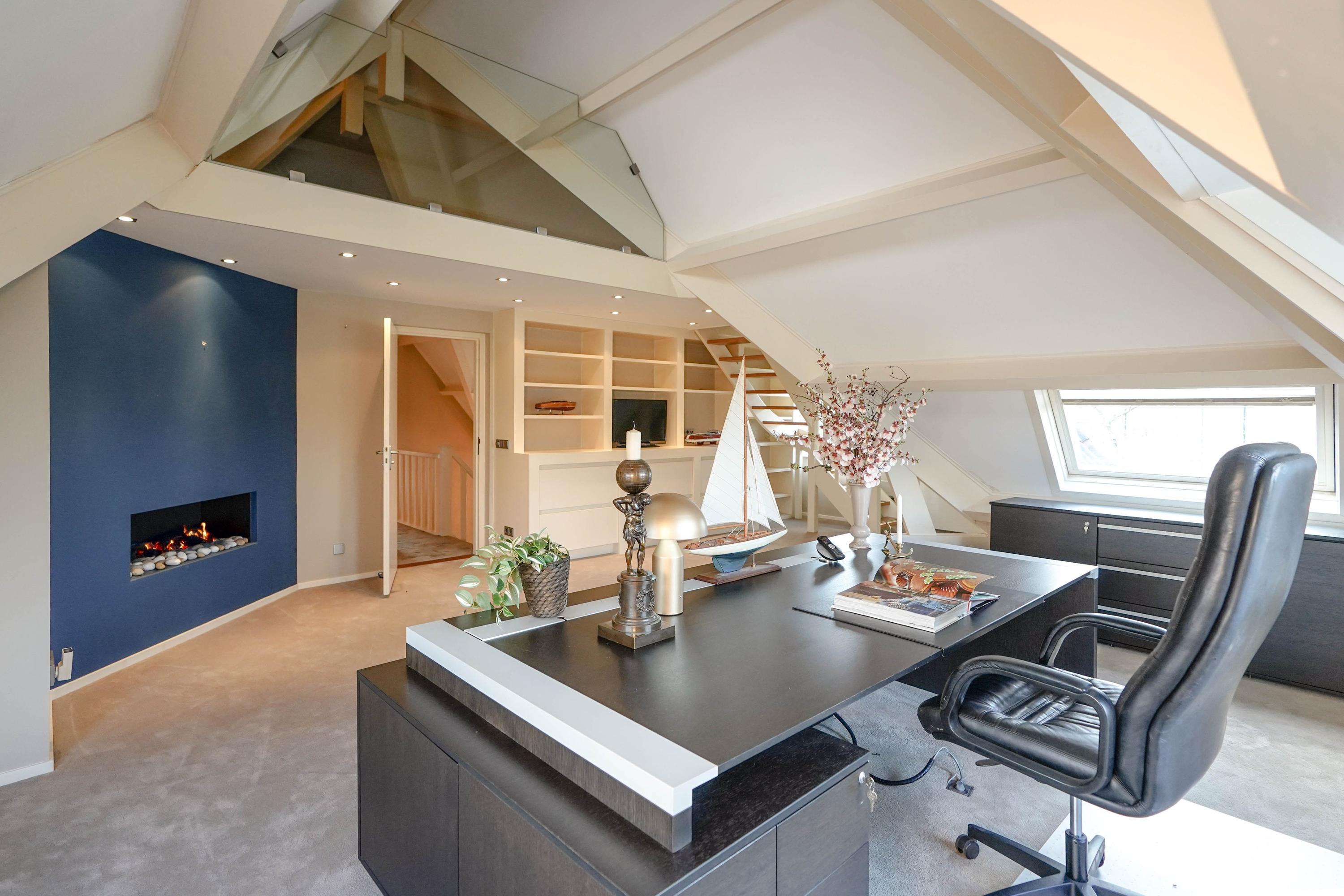 Overloop, de eerste badkamer voorzien van douche, dubbele wastafel en een toilet. Twee royale, identieke kinderslaapkamers met een vaste trap naar een slaapvide. De master bedroom heeft een eigen badkamer en suite (voorzien van vloerverwarming), vaste kastenwand en openslaande deuren naar een dakterras met adembenemend uitzicht. Last but not least vindt u op de eerste verdieping de zeer ruime werkkamer met gashaard, uitzicht op het water, op maat gemaakte vaste kasten en een vaste trap naar de vide en grote bergzolder.