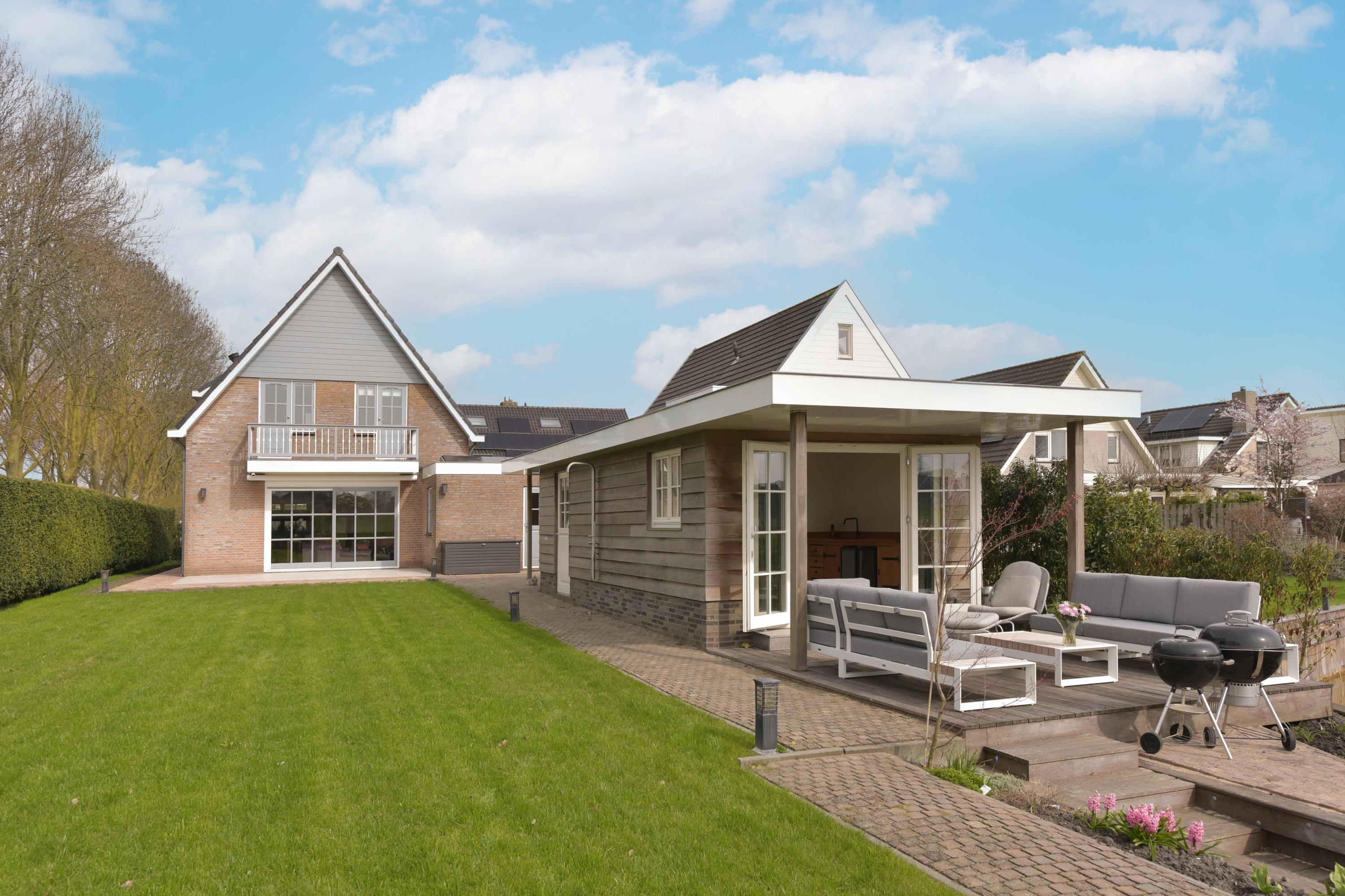 Het bijgebouw biedt bijzonder veel bergruimte en is zelfs voorzien van vloerverwarming. Aan de voorzijde een praktische berging waar ook de omvormer hangt van de PV installatie. Aan de achterzijde bevindt zich een luxe relaxruimte met sauna met een biokachel zodat er gekozen kan worden tussen een Finse sauna, een stoom sauna, kruidensauna en een geurensauna, regendouche, toilet en een houten keukenblok met twee horeca koelkasten, een plek waar ontspanning centraal staat. Het lager gelegen, aangrenzende terras biedt een prachtig uitzicht over het water en het omliggende groen en nodigt uit tot lange, ontspannen avonden. Achterin de tuin vind je diverse fruitbomen, waaronder een pruimenboom en een walnotenboom, en een volledig uitgeruste moestuin met water en elektriciteit. Door de gehele tuin is sfeervolle verlichting aangebracht en via een praktische achterom is de tuin ook buitenom bereikbaar. Een fantastische tuin waarin je kunt relaxen, kinderen eventueel een plek kunnen vinden om uitgebreid te spelen, waar je een enorm gevoel van ruimte en vrijheid in ervaart, een unieke plek! Vrijwel de gehele woning is bovendien voorzien van plissé horren, wat bijdraagt aan het comfort in de warmere maanden.