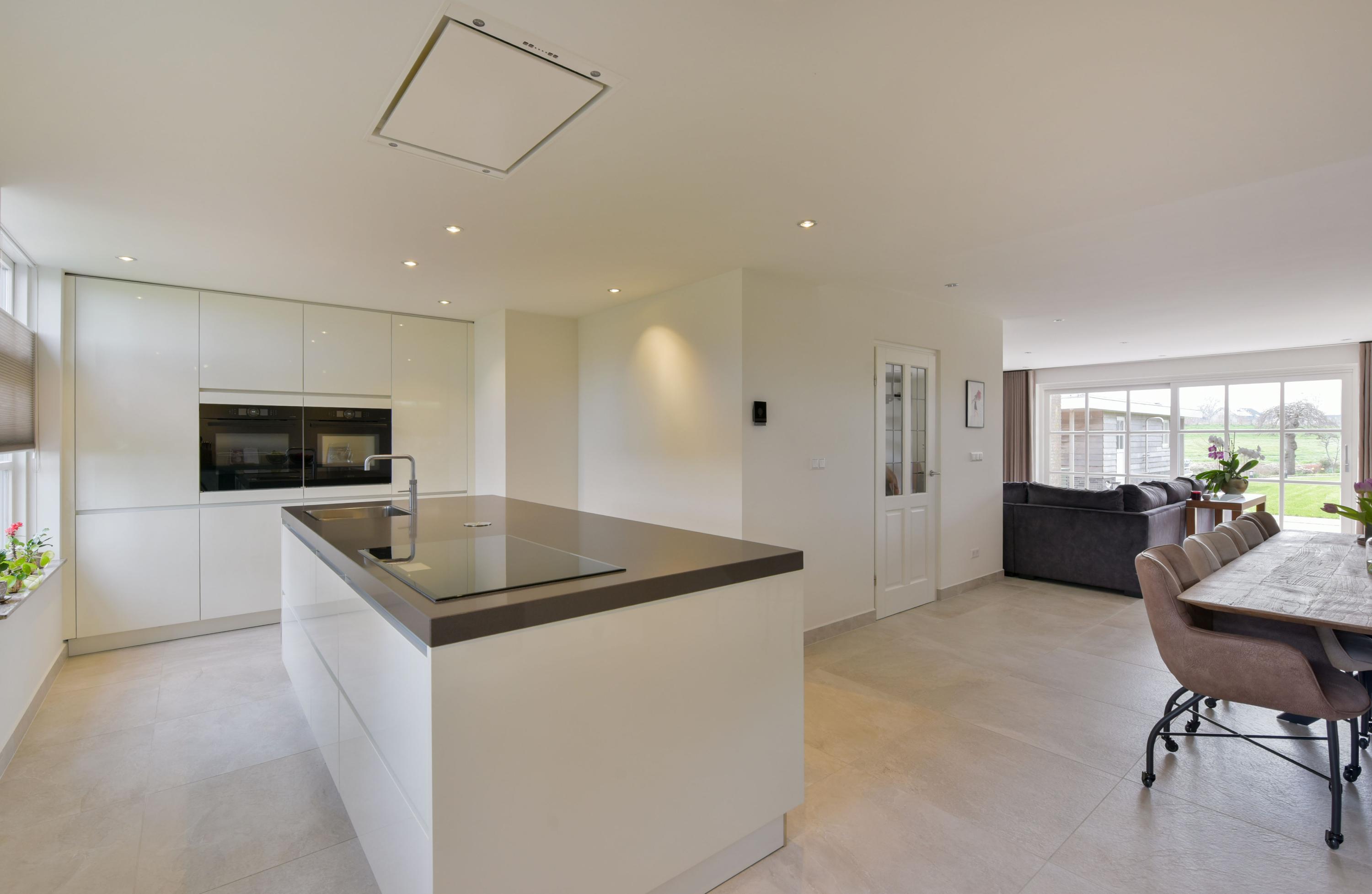 Bij binnenkomst valt direct de royale hal op, die zorgt voor een prettige en open ontvangst. Vanuit deze representatieve hal heb je toegang tot het toilet, de vernieuwde meterkast voorzien van een 3 fase aansluiting, de multifunctionele ruimte en de heerlijk lichte woonkamer met open keuken. De L-vormige woonkamer bevindt zich aan de achterzijde van de woning en is een heerlijke plek om samen te komen. Grote raampartijen en de schuifpui zorgen voor een prachtige lichtinval en een naadloze verbinding met de tuin. Het vrije uitzicht over het groen maakt dat elk seizoen hier zijn charme heeft. De keramische vloer met vloerverwarming ( op de gehele BG), de subtiel geïntegreerde spotverlichting en de strak weggewerkte bekabeling dragen bij aan de rustige, moderne uitstraling. Aan de voorzijde van de woning ligt de indrukwekkende open keuken geplaats in 2019 , die met recht riant te noemen is. Het grote kookeiland vormt het centrale punt, perfect om samen te koken of gezellig aan te zitten. Aan beide zijden vind je stijlvolle kastenwanden met een compleet pakket aan inbouwapparatuur: een combi-oven, stoomoven, koelkast, vriezer, vaatwasser, inductiekookplaat, plafondafzuiging, Quooker en 2 wijnklimaatkasten. De gehele woning is voorzien van spotledverlichting met touch-dimmers, wat zorgt voor een sfeervolle en flexibele verlichting. Vanuit de centrale hal bereik je tevens de multifunctionele ruimte, voorheen de garage. Deze ruimte is nu volledig geïntegreerd in de woning en biedt talloze mogelijkheden, zoals een werkruimte, praktijk aan huis of extra leefruimte. Hier bevindt zich ook een moderne badkamer van 2022 voorzien van een dubbele regendouche ’s , wastafel, wc en design elektrische handdoekradiatoren, dus ook een slaapkamer op de begane grond behoort tot de mogelijkheden.