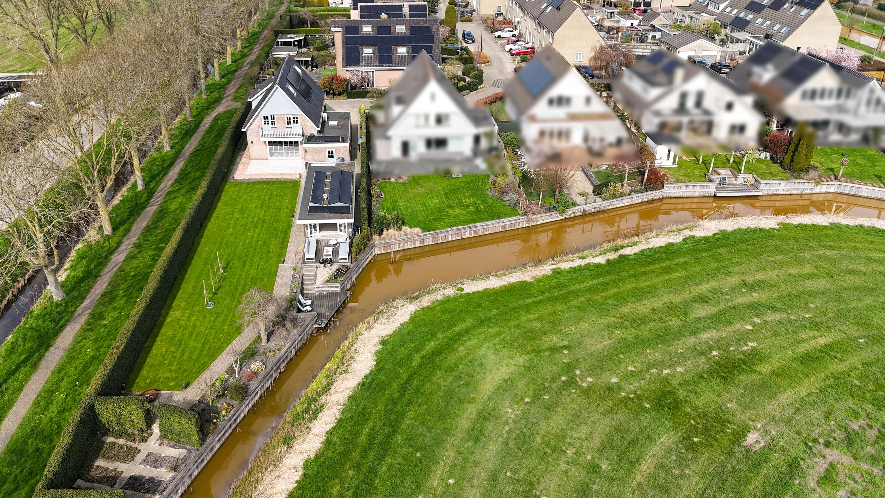 De tuin rondom de woning is met zorg aangelegd en perfect onderhouden. Dankzij een geavanceerd sproei- en druppelsysteem, gevoed door een pomp vanuit de sloot, blijft het groen in optimale conditie. Het ruime terras op het zuiden, voorzien van grote keramische tegels die naadloos aansluiten bij de vloer binnen, vormt een heerlijke plek om te genieten van zonnige dagen. Het elektrische zonnescherm is eenvoudig via een app te bedienen.