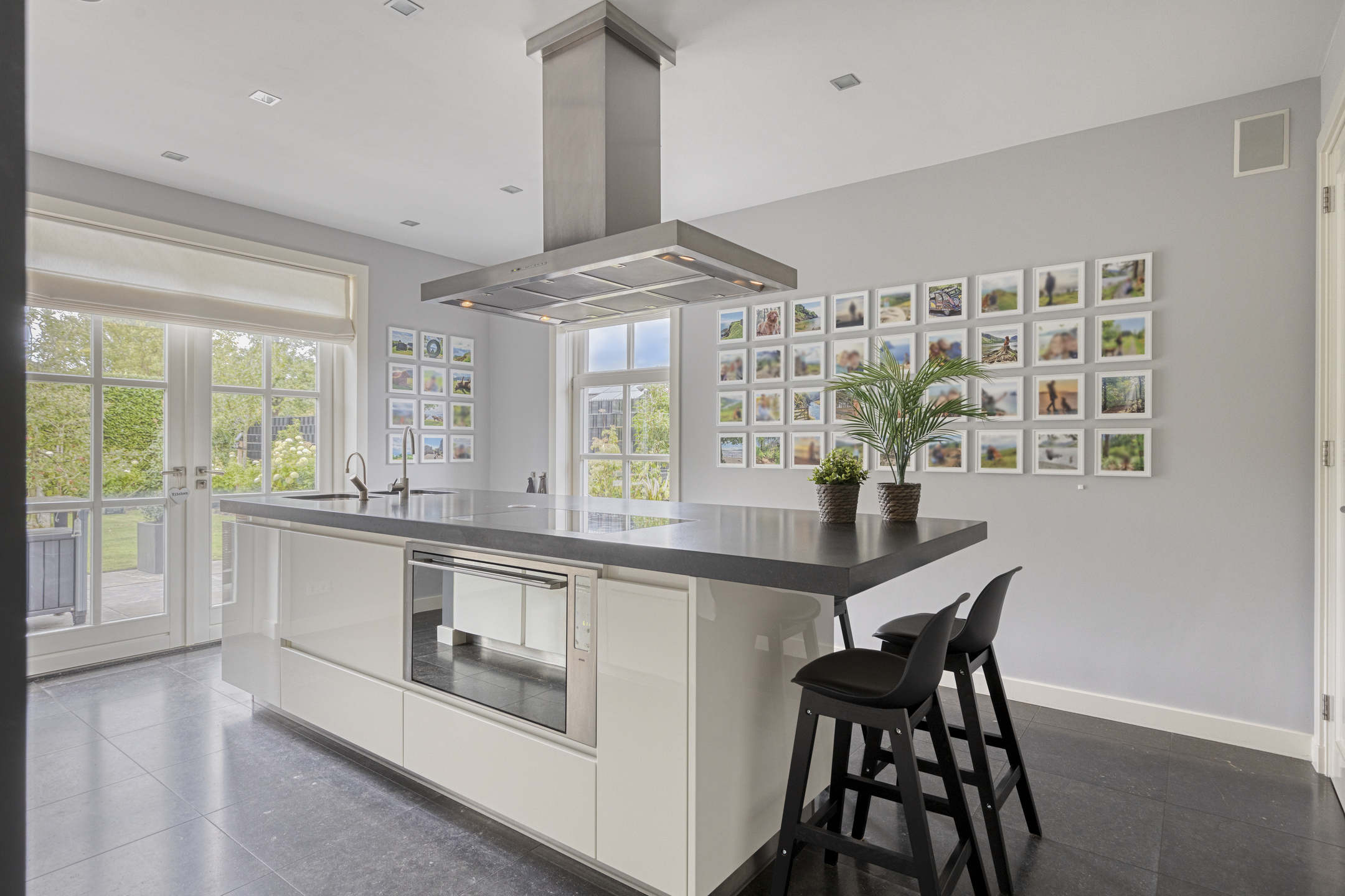 Woonkeuken: moderne Bosch/Miele?inbouwapparatuur met kook-/spoel-eiland en geïntegreerde eettafel; composiet werkblad met dubbele spoelbak en Quooker; Miele inductiekookplaat met Miele afzuigschouw; kastenwand met Bosch inbouw koffiemachine, Bosch koelkast (met freshzone), Bosch vriezer, 2x Bosch combi?oven/magnetron, ATAG elektrische oven (90 cm), Miele vaatwasser op ergonomische hoogte.