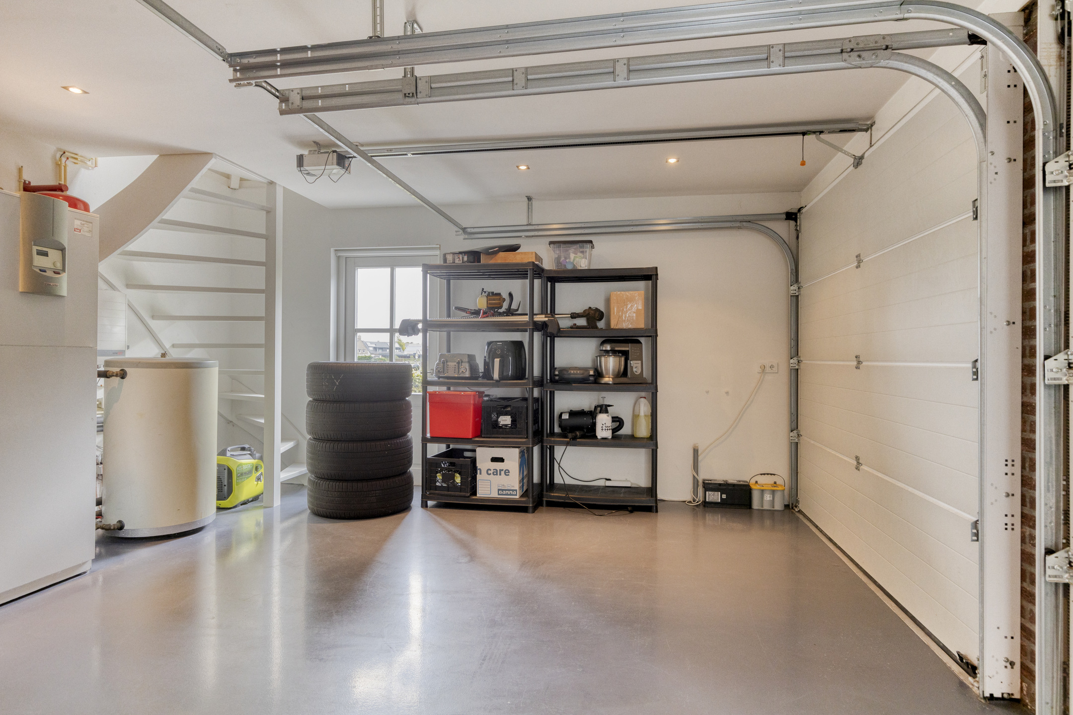 Dubbele garage (ca. 37 m²): direct aan de woning; twee elektrisch bedienbare sectiedeuren naar de oprit; separate loopdeur naar de tuin; opstelplaats warmtepompinstallatie en omvormer zonnepanelen; met gepolijste en gecoate betonvloer ; vaste trap naar de 1e verdieping en kamer ( man-cave/chill-room met bar – ca. 16 m²) boven de garage incl. opstelplaats voor Mechanische Ventilatie unit en centraal stofzuigsysteem t.b.v. de volledige woning.