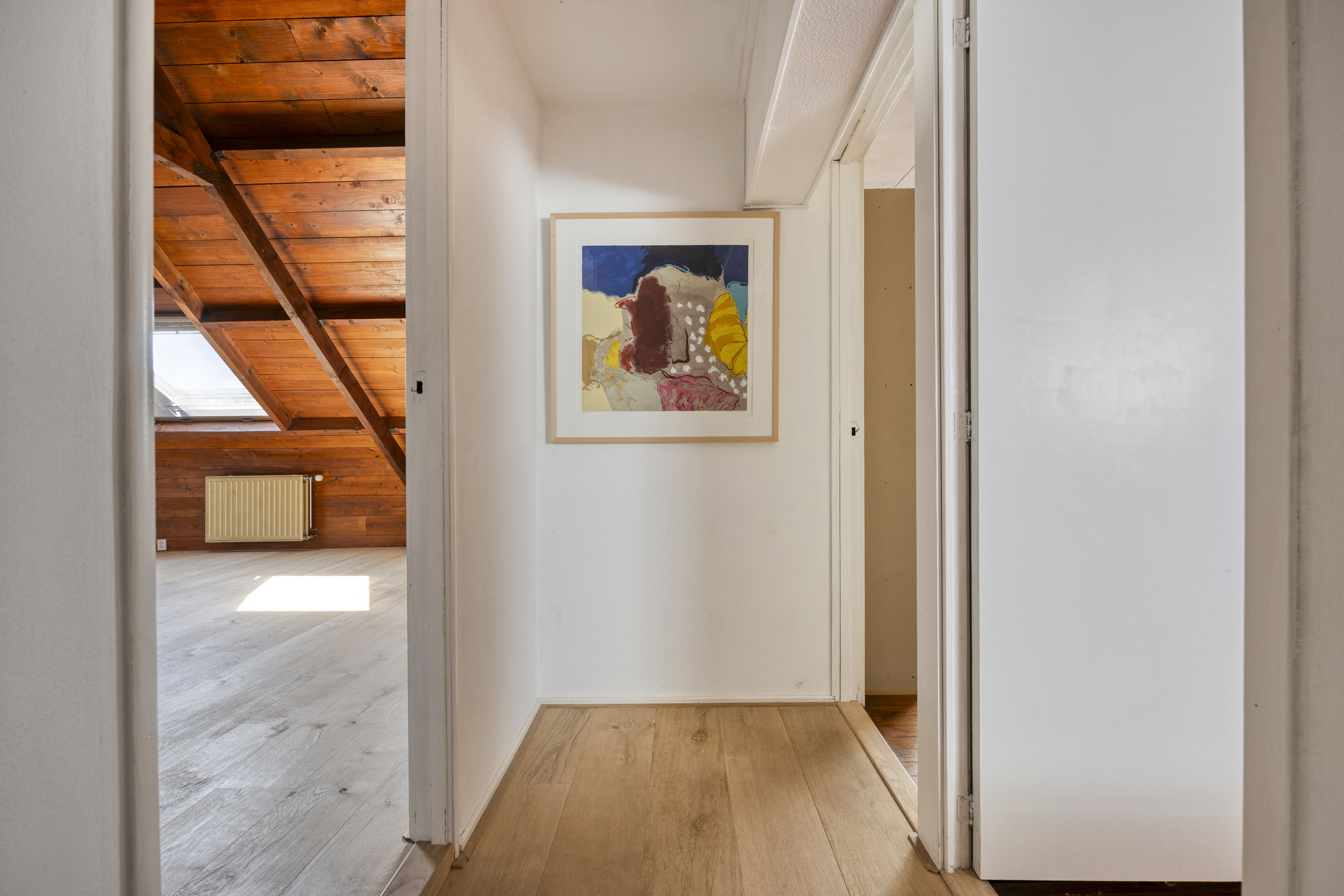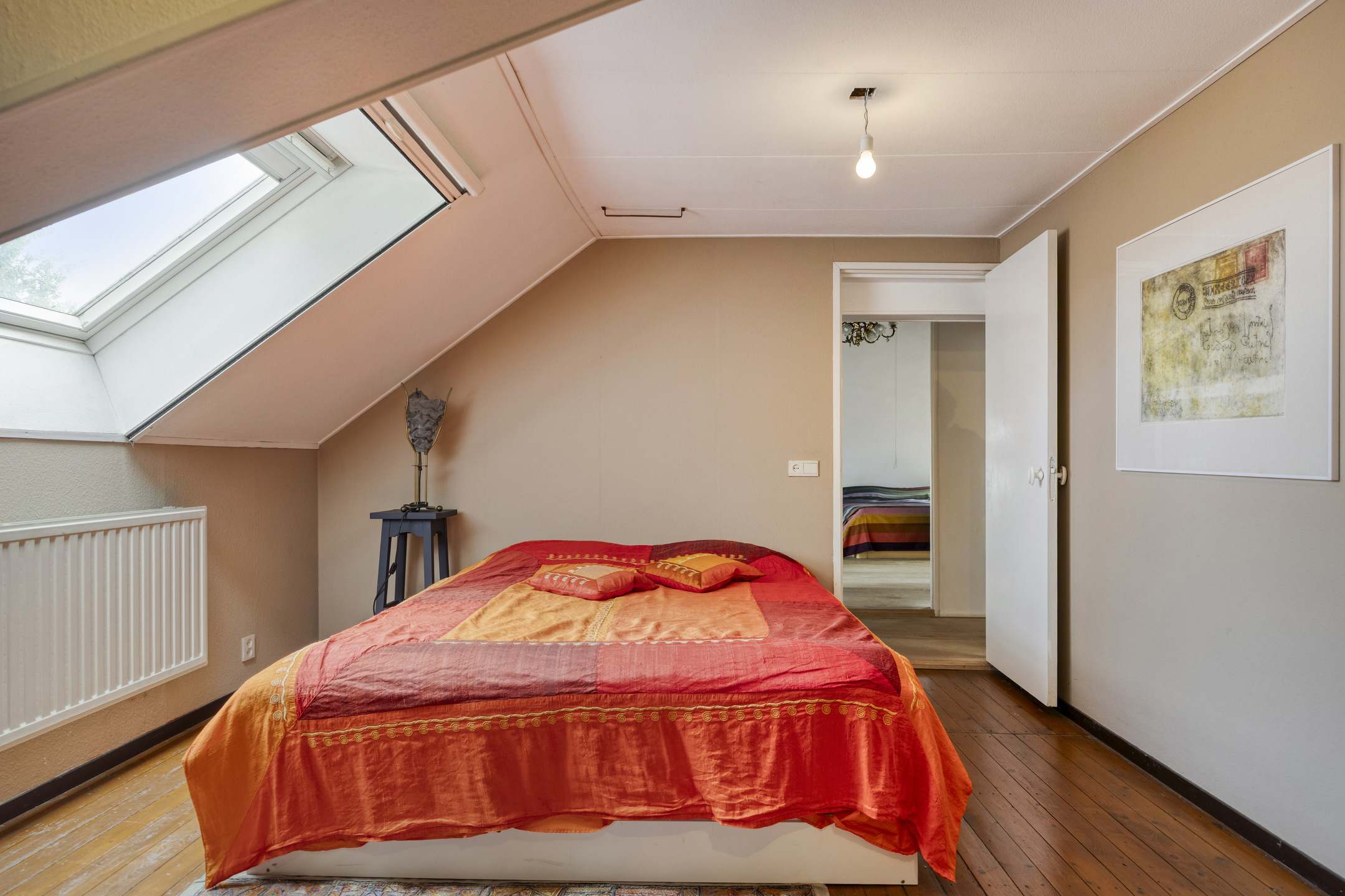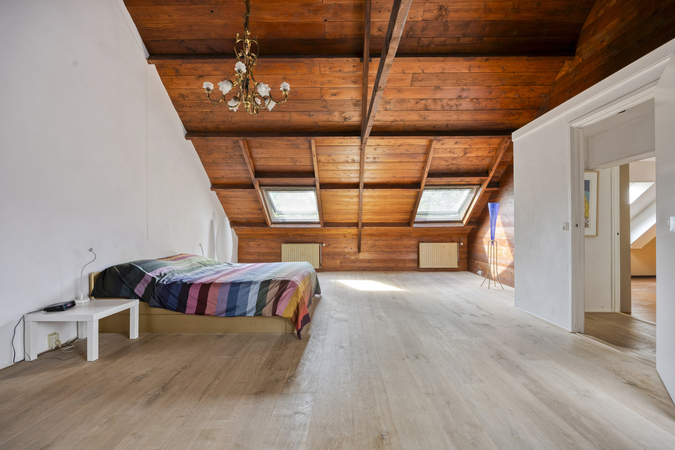 hoofdslaapkamer met een 3-tal dakramen, wandafwerking stucwerk, laminaatvloer met eiken bovenlaag, fraai zicht op de houten balkenconstructie, inloopkast vv. omvormer en een dakraam;