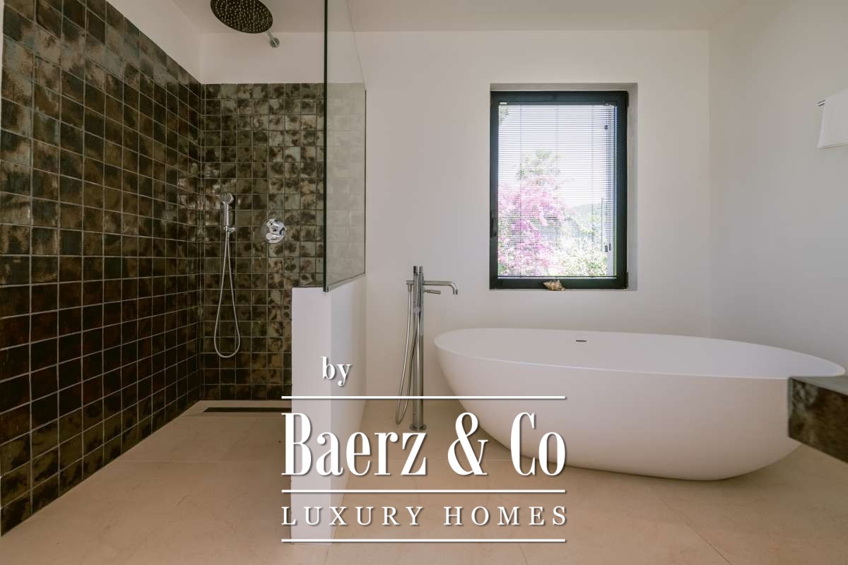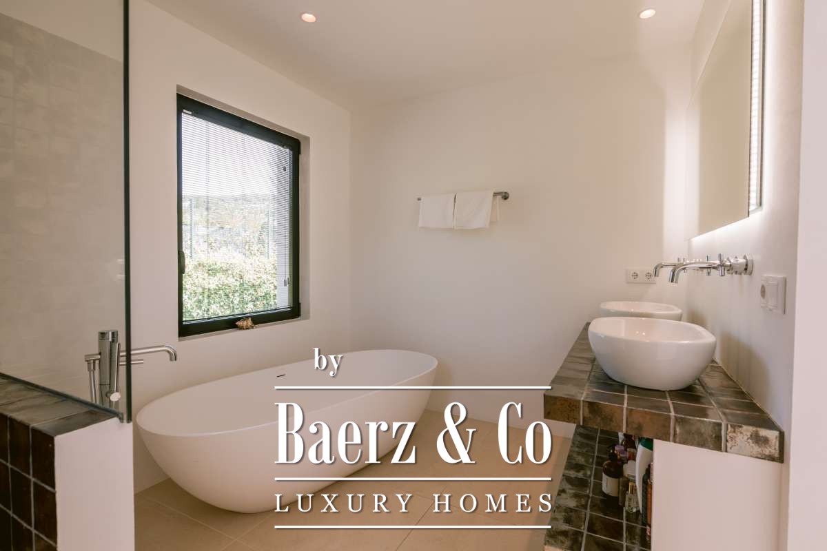 Четкие белые линии и тепло массивного деревянного входа формируют характер одноэтажной планировки. Просторная гостиная включает камин и встроенные ниши. Открытая кухня организована вокруг большого острова, оборудована винным холодильником и техникой премиум-класса Bosch и Gaggenau. В доме пять спален и четыре ванные комнаты — три из них представлены люксами с собственными ванными. Одна спальня находится в независимых апартаментах с отдельным входом, кухней и санузлом, что идеально для размещения гостей на длительный срок или персонала.