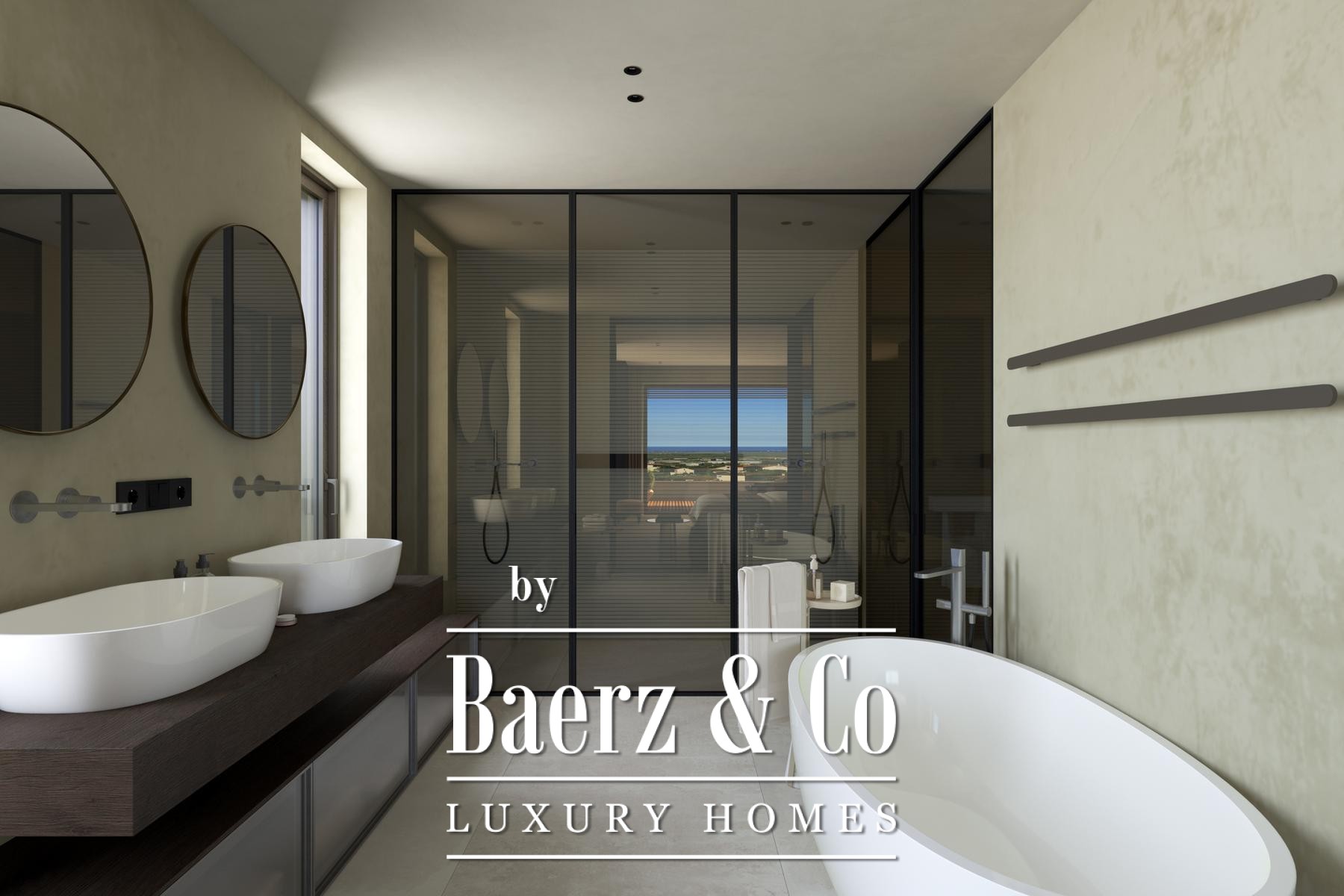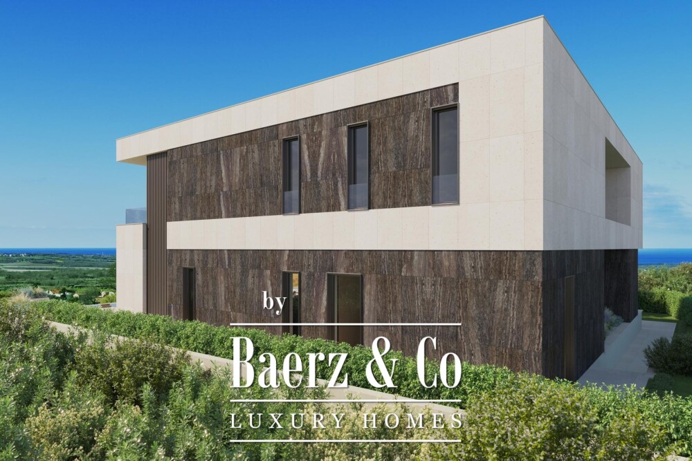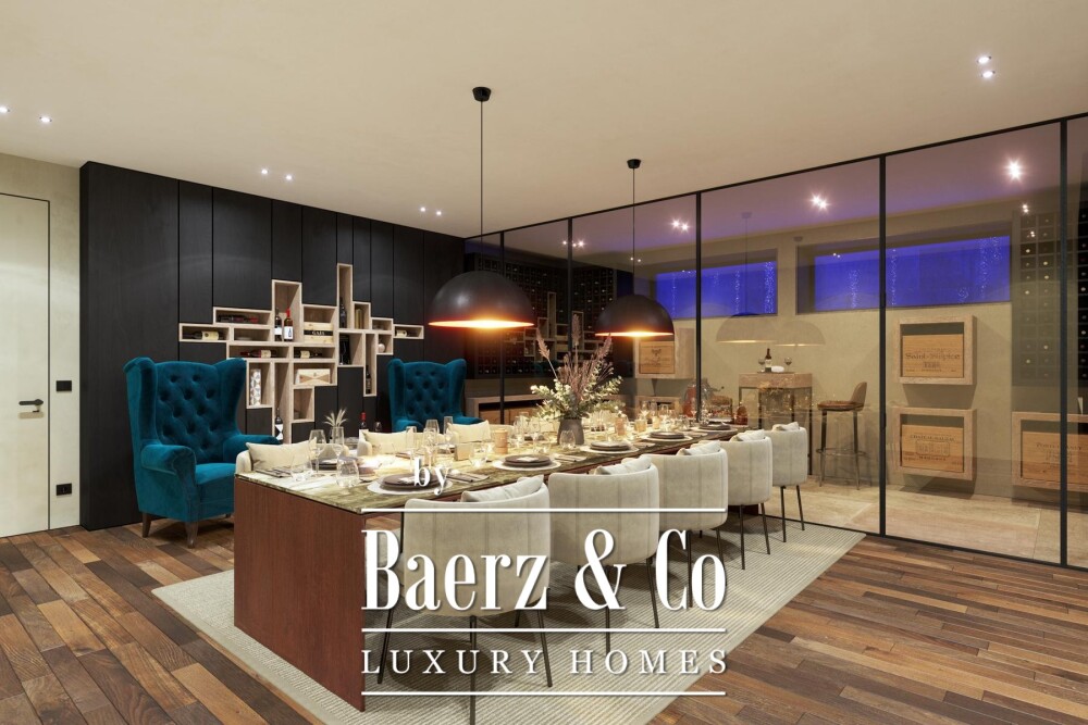 На верхнем уровне две мастер-сьюты и ещё две спальни, каждая с собственной ванной комнатой и выходом на крытую террасу с видом на Адриатику. Подвал не уступает по продуманности: просторный гараж на три автомобиля, кладовая, два технических помещения, прачечная, оздоровительный блок с джакузи и сауной, а также винный погреб для неформальных встреч.