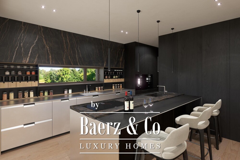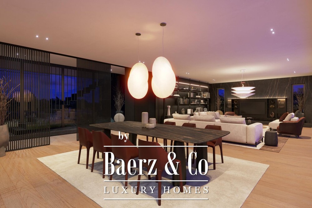 На первом этаже кухня, столовая и гостиная образуют единое пространство с плавными переходами. Широкие стеклянные двери открывают выход на крытую террасу, зону для загара и инфинити-бассейн площадью 67,04 м². Рядом находится сауна, располагающая к уединённому отдыху, а просторные гостевые помещения идеально подходят для изысканных приёмов.