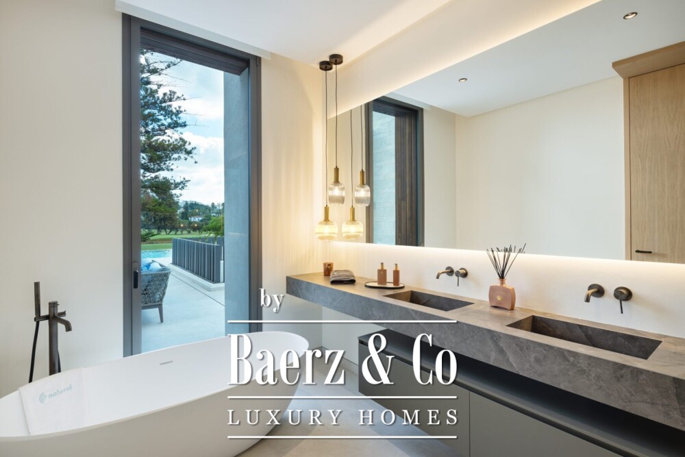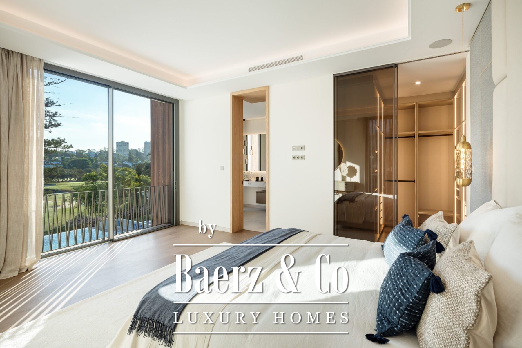 Снаружи ландшафтный дизайн обеспечивает плавные переходы между частным бассейном, зоной костра, крытой уличной кухней и перголой. Ориентация виллы гарантирует солнечный свет в течение всего дня, а расположение на первой линии гольф-поля открывает непрерывные виды и абсолютную приватность.