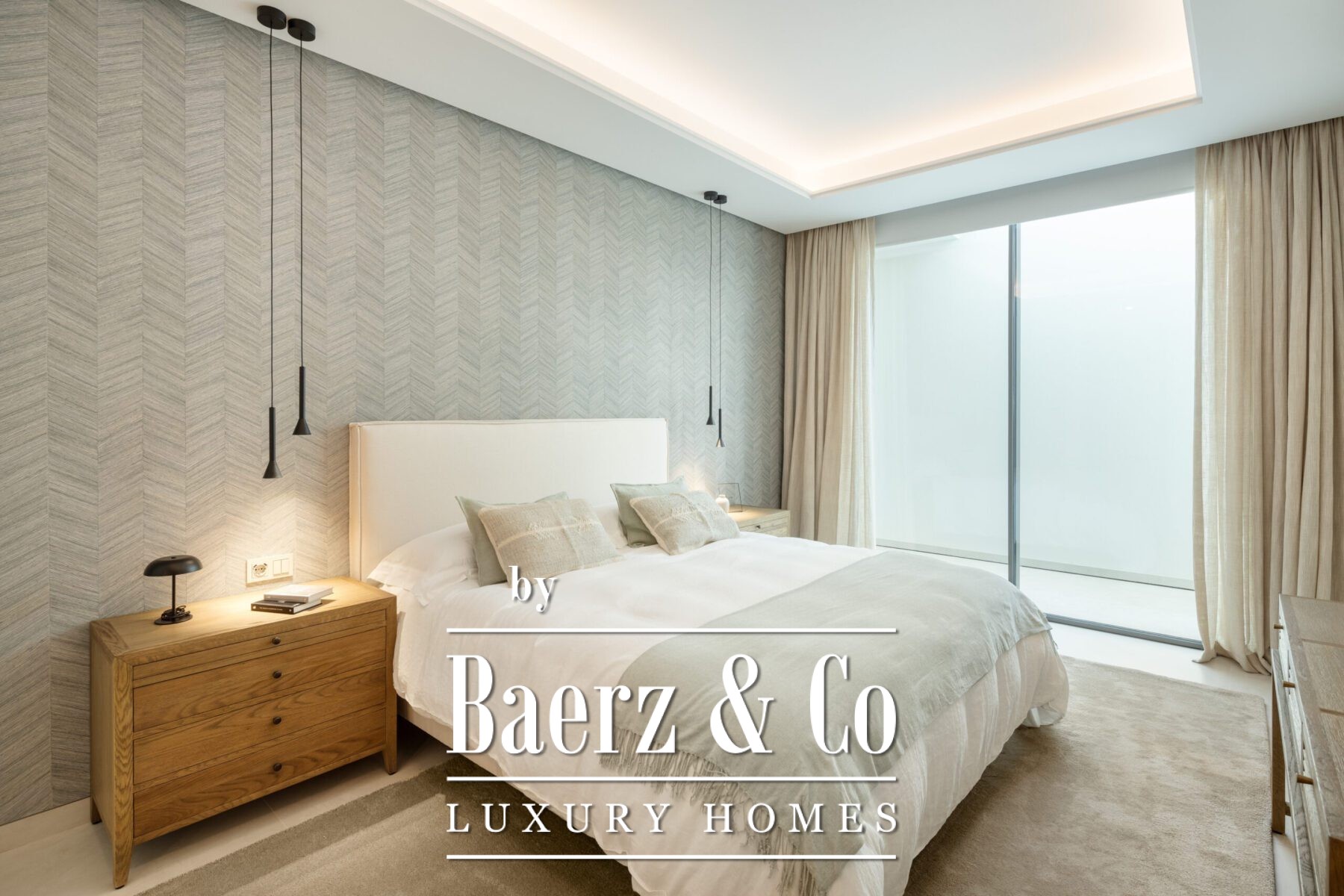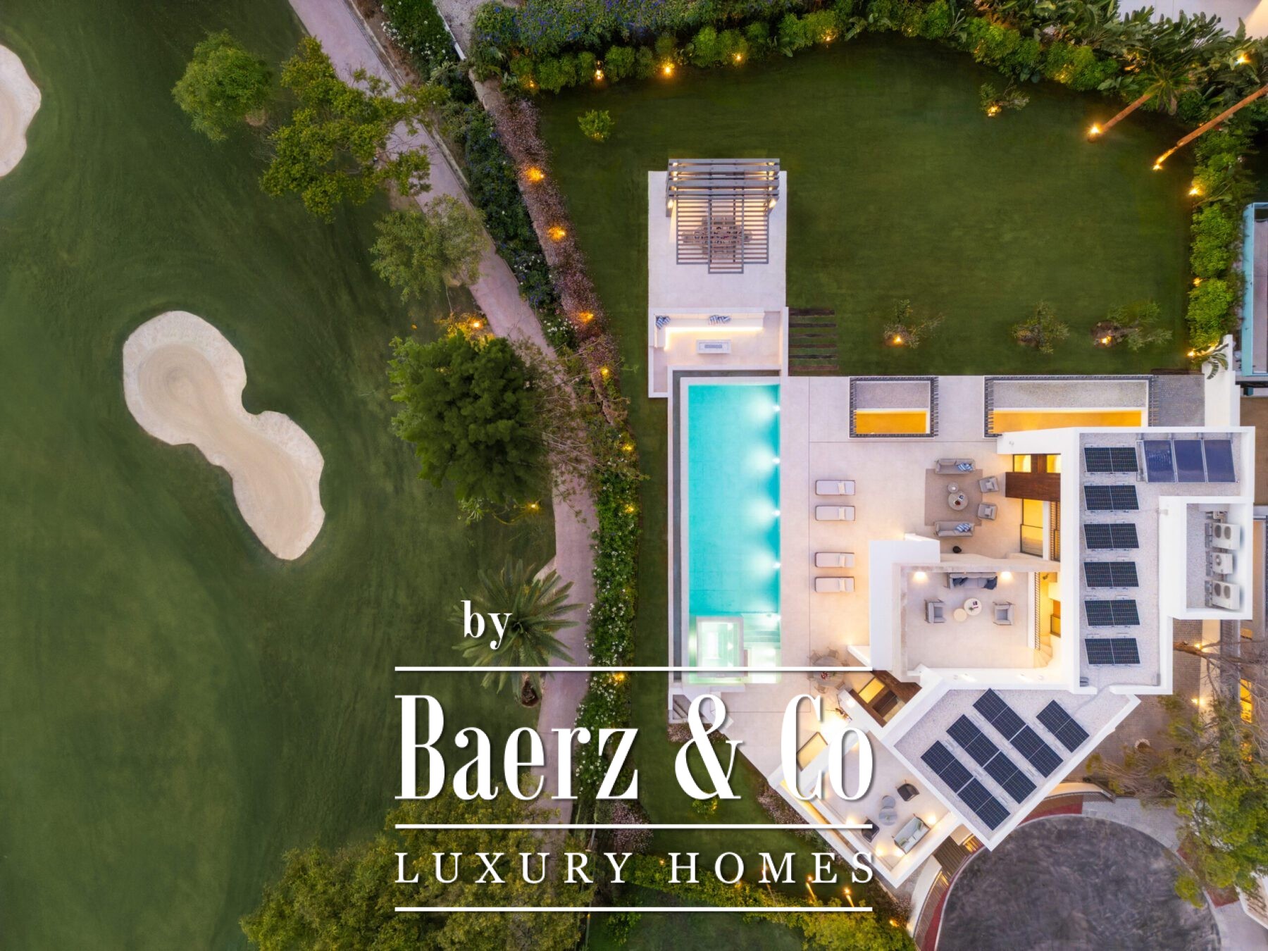 Внутри пять спален с индивидуальными ванными комнатами и дополнительный гостевой санузел создают впечатление простора и достойный уровень комфорта как в повседневной жизни, так и при приеме гостей. Высокие потолки, панорамные окна и премиальная отделка формируют атмосферу, которую гармонично дополняют теплое LED-освещение, деревянные вставки и тщательно интегрированный камень. Просторная кухня оснащена техникой высокого класса, большим островом и открывает панорамные виды на бескрайний бассейн, джакузи и поля для гольфа. Каждая главная зона расположена так, чтобы максимально использовать солнечный свет и обрамлять панорамные перспективы на гору Ла Конча, гольф-поле и спокойное озеро.