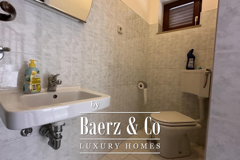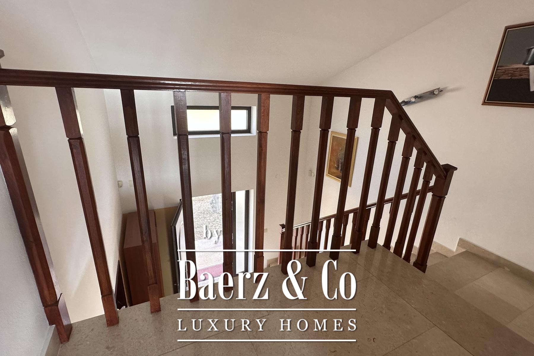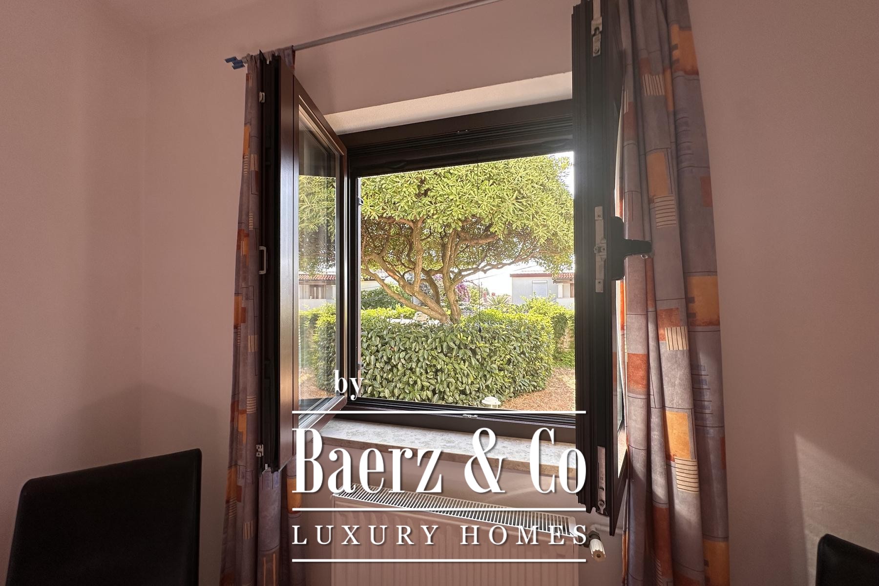 Для максимального комфорта и гибкости на первом этаже спланирована квартира с одной спальней, ванной комнатой, открытой зоной гостиной и кухней, переходящей в застекленную террасу. Окружающий сад создает атмосферу уединения; при этом план строительства частного бассейна уже готов. Практичность обеспечивают кладовые и гараж площадью 40 м², а дополнительное парковочное место во дворе придает мобильности.