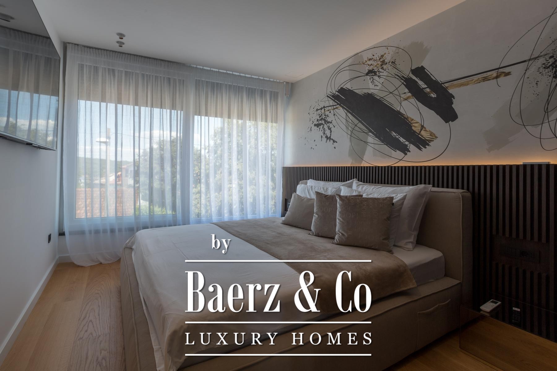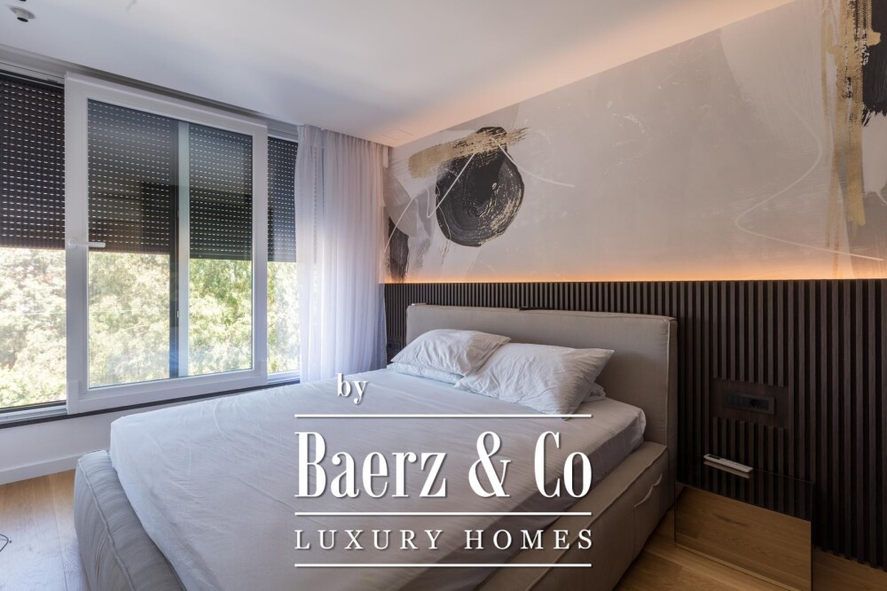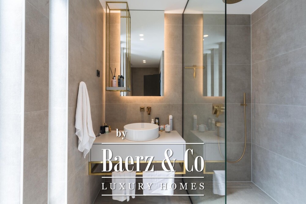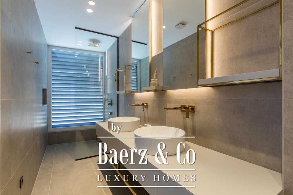 На первом этаже расположены четыре просторные спальни с отдельными ванными комнатами, создающие атмосферу сдержанной роскоши. Ванные совмещают элитную сантехнику Villeroy&Boch и золотую фурнитуру Hansgrohe, а душевые кабины и двери—стеклянные или облицованные деревом на заказ—подчеркивают высокий уровень исполнения. По всему дому продуманный свет и настенные покрытия создают приватность, а тёплые полы на тепловом насосе гарантируют комфорт в течение всего года.