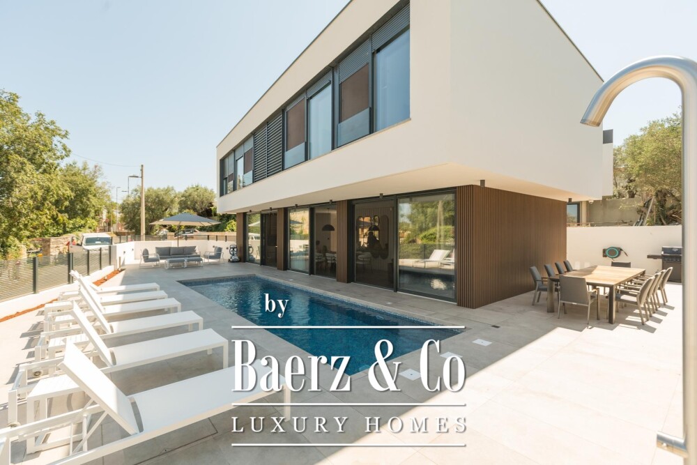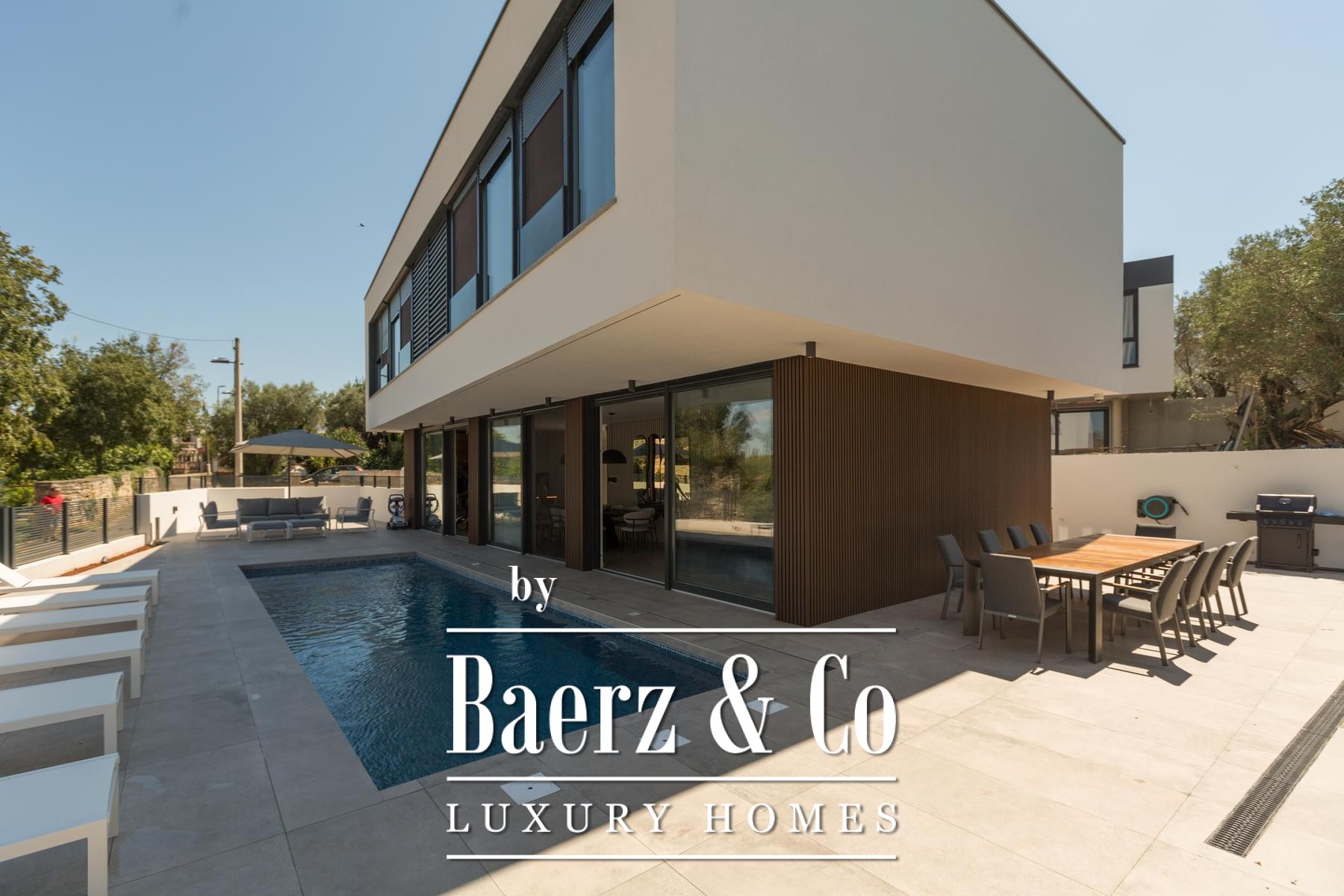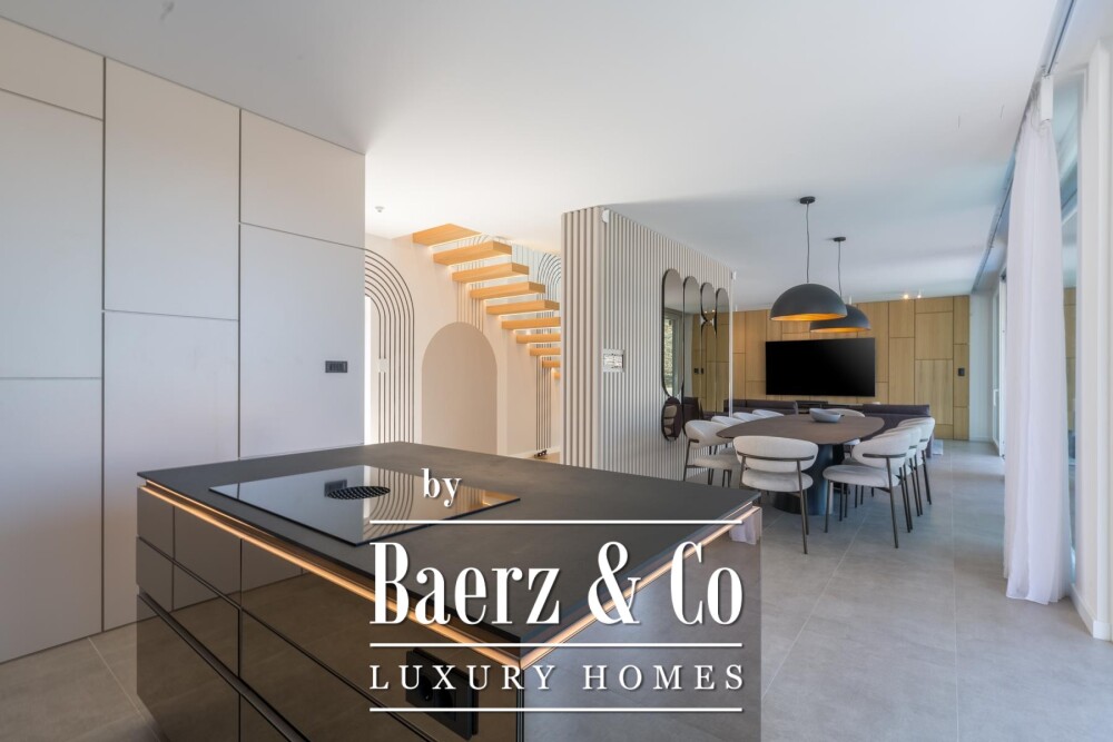 Вход ведёт в пространство, буквально залитое естественным светом через три панорамные раздвижные стеклянные двери. Первый этаж предлагает открытую планировку с гостиной, столовой и кухней вокруг центрального острова, а также гостевым санузлом и отдельным помещением для хранения. Вся вилла тщательно меблирована индивидуально изготовленной итальянской мебелью Caligaris.