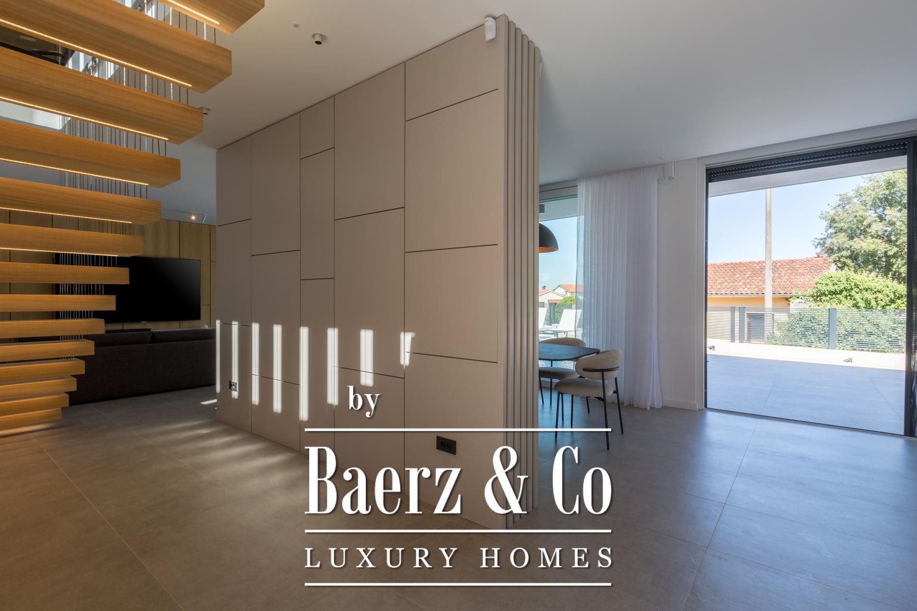 Парящий лестничный пролёт с освещёнными деревянными ступенями, бронзовыми стеклянными ограждениями и деталями из нержавеющей стали соединяет этажи, поддерживая гармонию формы и функции. На участке расположен частный бассейн 10 на 3 метра. Три парковочных места повышают практичность проживания в Ровине. Это предложение объединяет мировые дизайн-стандарты и спокойствие жизни истрийской деревни.
