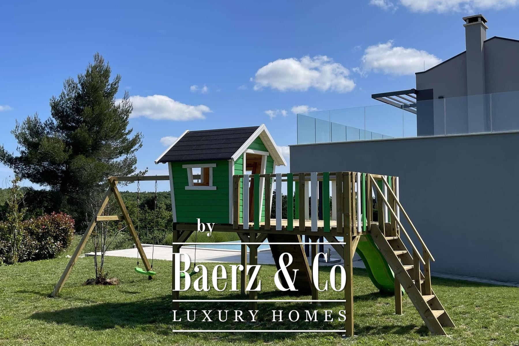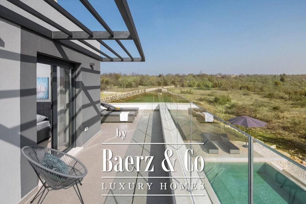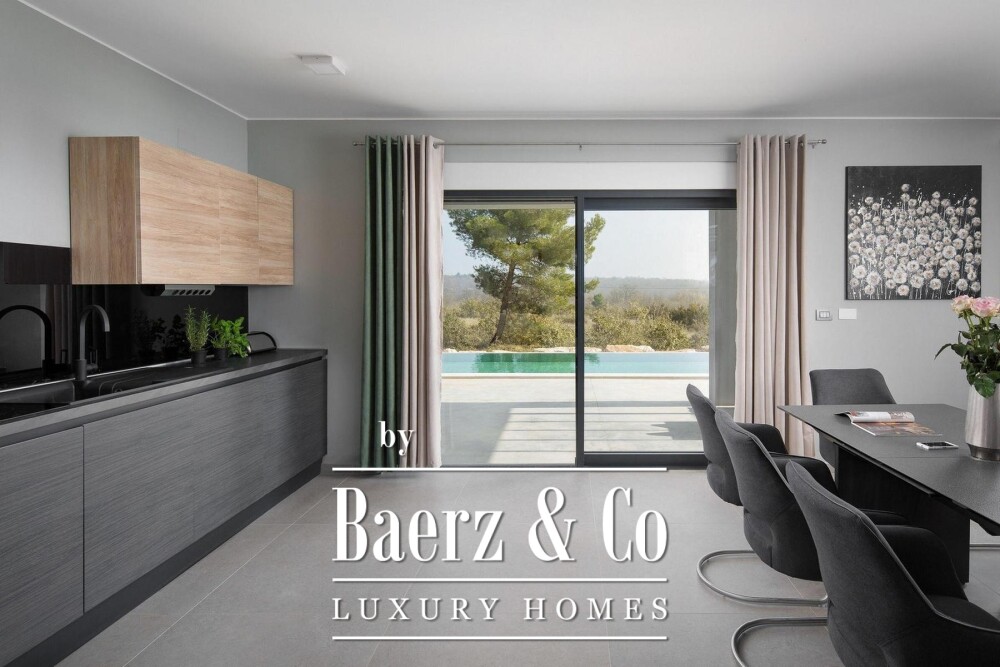 Townhouse Vodnjan — это утонченное место для отдыха, окруженное 1 600 м² тщательно обустроенных садов, раскинувшихся вокруг просторного интерьера площадью 250 м². Этот дом с четырьмя спальнями и четырьмя ванными располагается в тихом и приватном уголке, где основное внимание уделяется уединению и панорамным видам на живописную зелень. Первый этаж наполнен естественным светом: гостиная с высокими стеклянными стенами открывается непосредственно в сад, а большая кухня и гостевой санузел гармонично завершают пространство для повседневной жизни. Зона приема гостей выходит на крытую террасу с видом на переливной гидромассажный бассейн площадью 78 м², который безупречно сочетается с окружающим ландшафтом и природой.