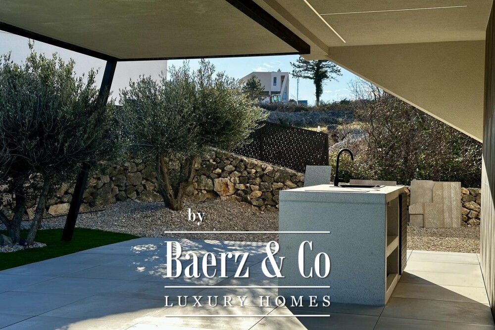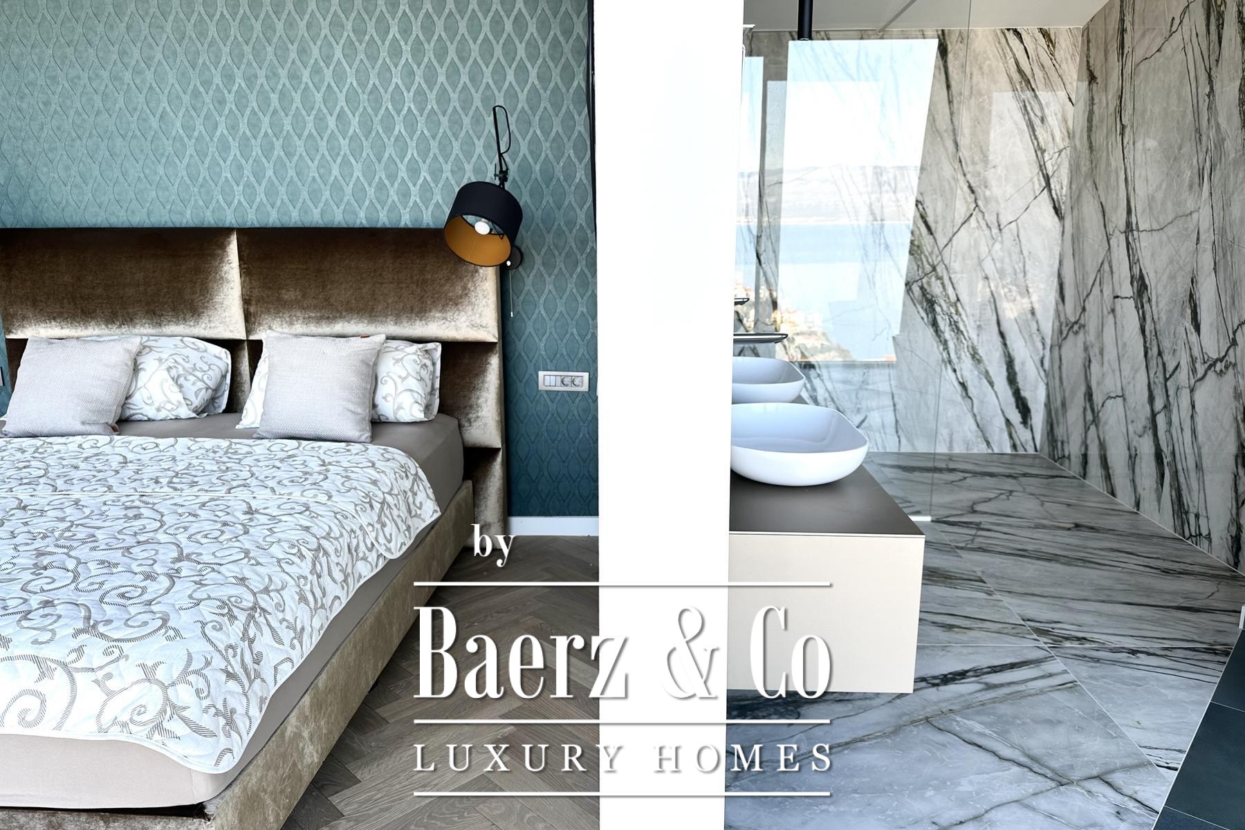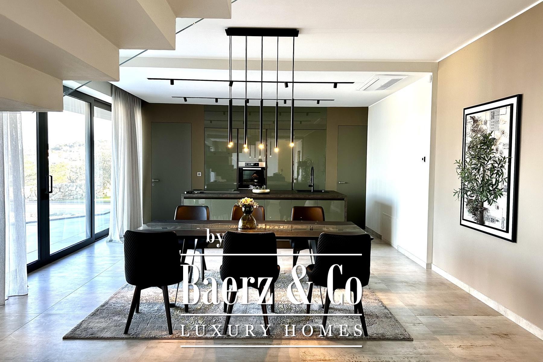 На верхнем этаже три спальни с ванными комнатами обеспечивают приватность и гармонию пространства. В оформлении акцент сделан на открытость, с перспективами на природу и умиротворяющую синеву моря. Эта вилла в Врбнике, благодаря своей ориентации и естественному переходу между зонами, воплощает современный средиземноморский стиль жизни, подчеркнутый светом, воздухом и чистотой материалов. Покой здесь подчеркивает связь с природой и глубокий комфорт.