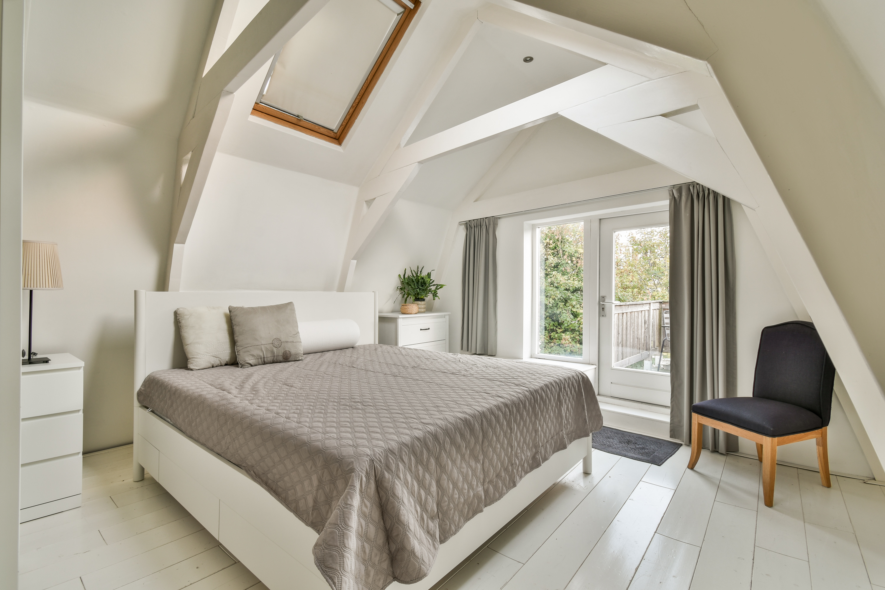 二楼为完整自持空间,独立出入,生活与用餐区域均按采光最大化理念布局。该层还设有独立厨房和专属书房或居家办公空间。三楼以别具一格的屋顶造型、天窗与阁楼窗为特色,配备两间宽敞卧室和一间浴室,主卧可通往约5平方米的南向阳台。