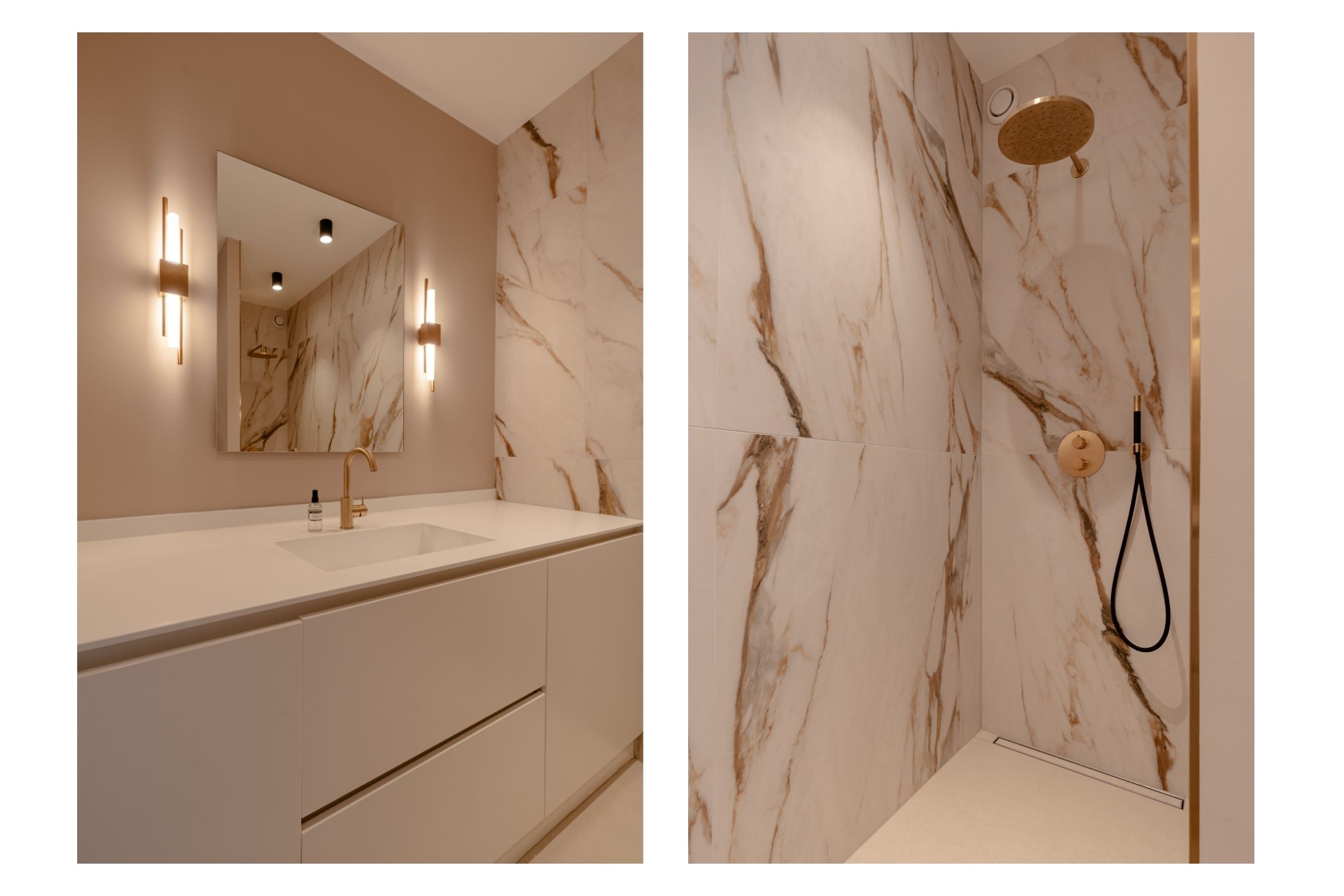 楼上设有四间卧室,每间都配有嵌入式衣柜和空调,以及以协调低调风格装修的两间浴室。主卧与楼上后侧卧室通过法式门直通阳台,俯瞰翠绿的内庭花园。全屋地暖与双层玻璃窗确保舒适与能效。