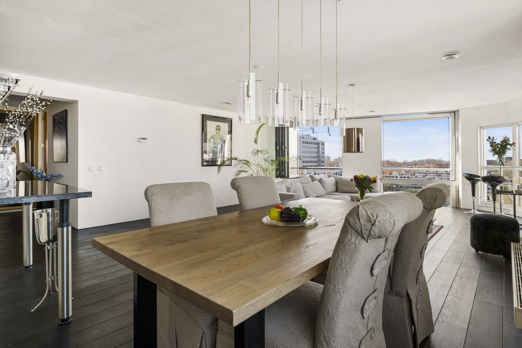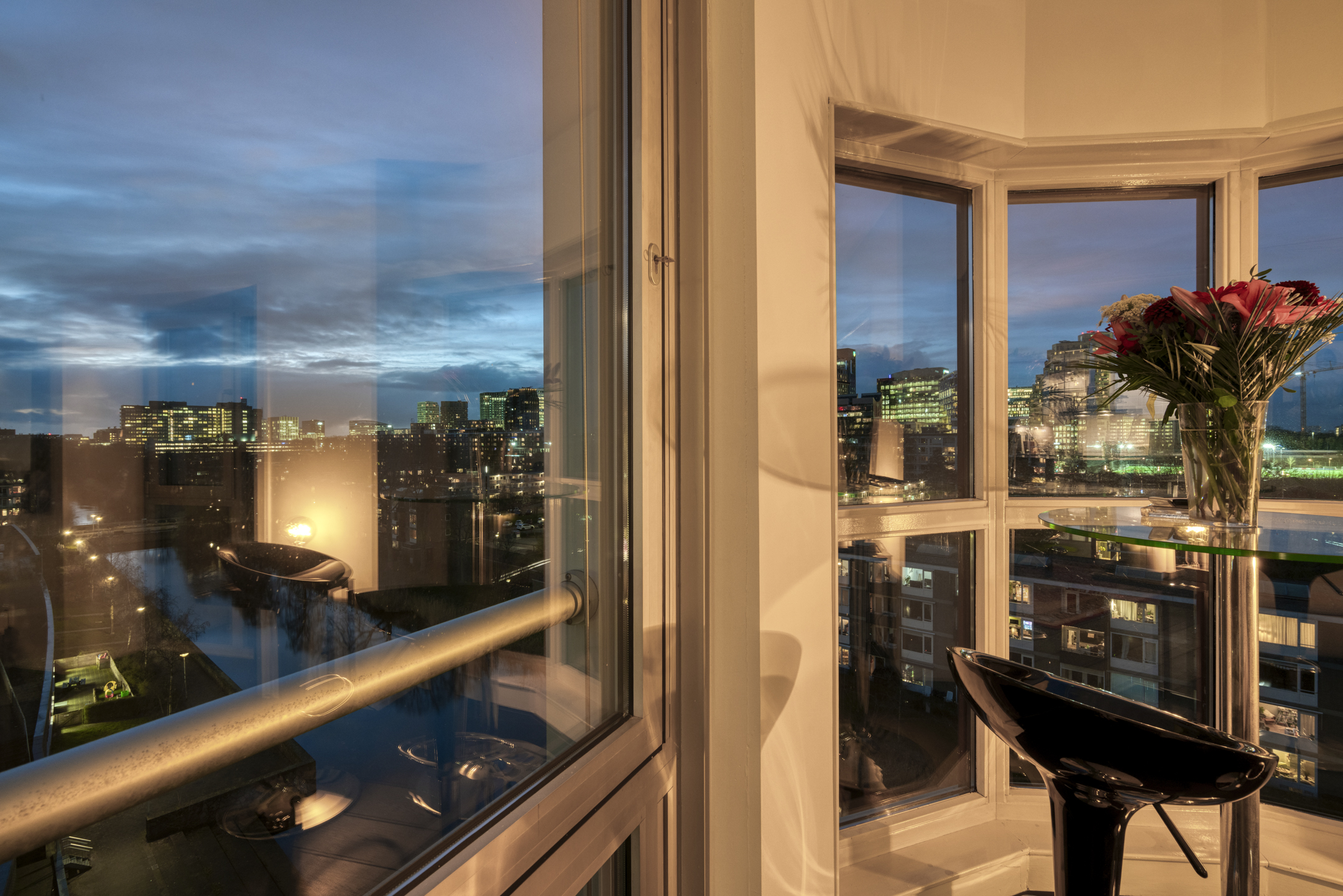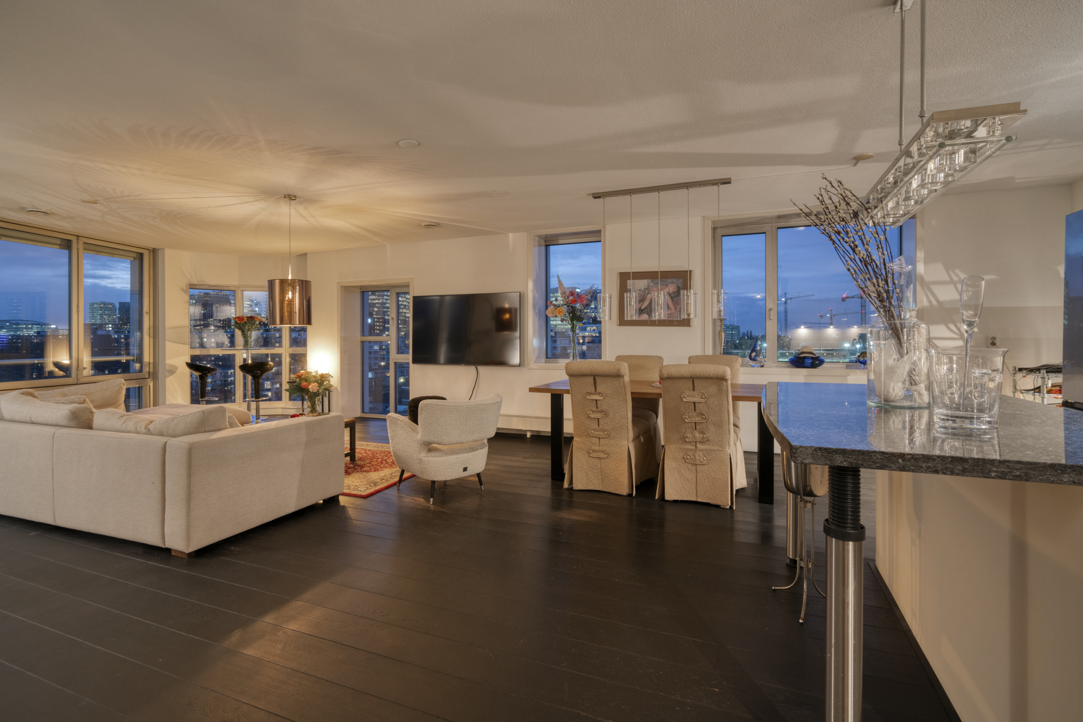 位于阿姆斯特丹Gelderhof综合体第七层的公寓,提供117平方米精致居住空间,并享有水域与Zuidas天际线的全景视野。该角落住宅专为充沛自然采光而设计,西南及北向落地窗将城市与水岸景色尽收眼底。房产设有两间宽敞卧室,目前布局为主套房配备步入式衣帽间,明亮客厅环绕玻璃幕墙及可折叠立面,高配厨房设有岛台、实木橡木地板和嵌入式家电,整体布局明晰且极具功能性。