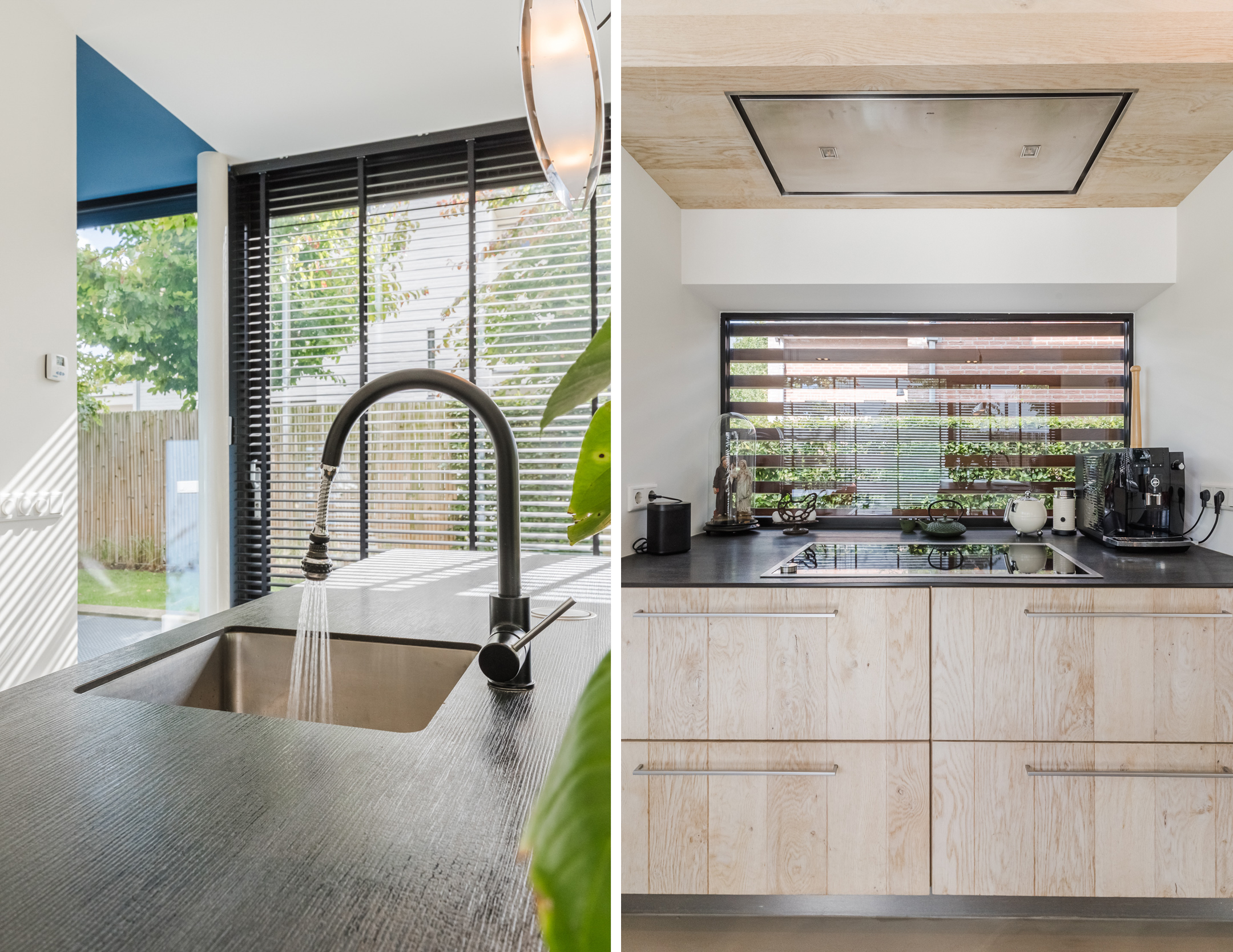 主要生活区域呈现出如阁楼般开阔的氛围:挑高天花、落地大窗,室内空间与室外露台自然衔接。底层一百多平方米专为联通与安逸而设计——开放式厨房配备 Gaggenau 洗碗机和超宽冰箱,光线充盈的休息区,以及可用作工作室或书房的多功能房间。每个空间均与东南向花园及带顶露台形成互动,一棵树精心穿过定制天窗向上生长。