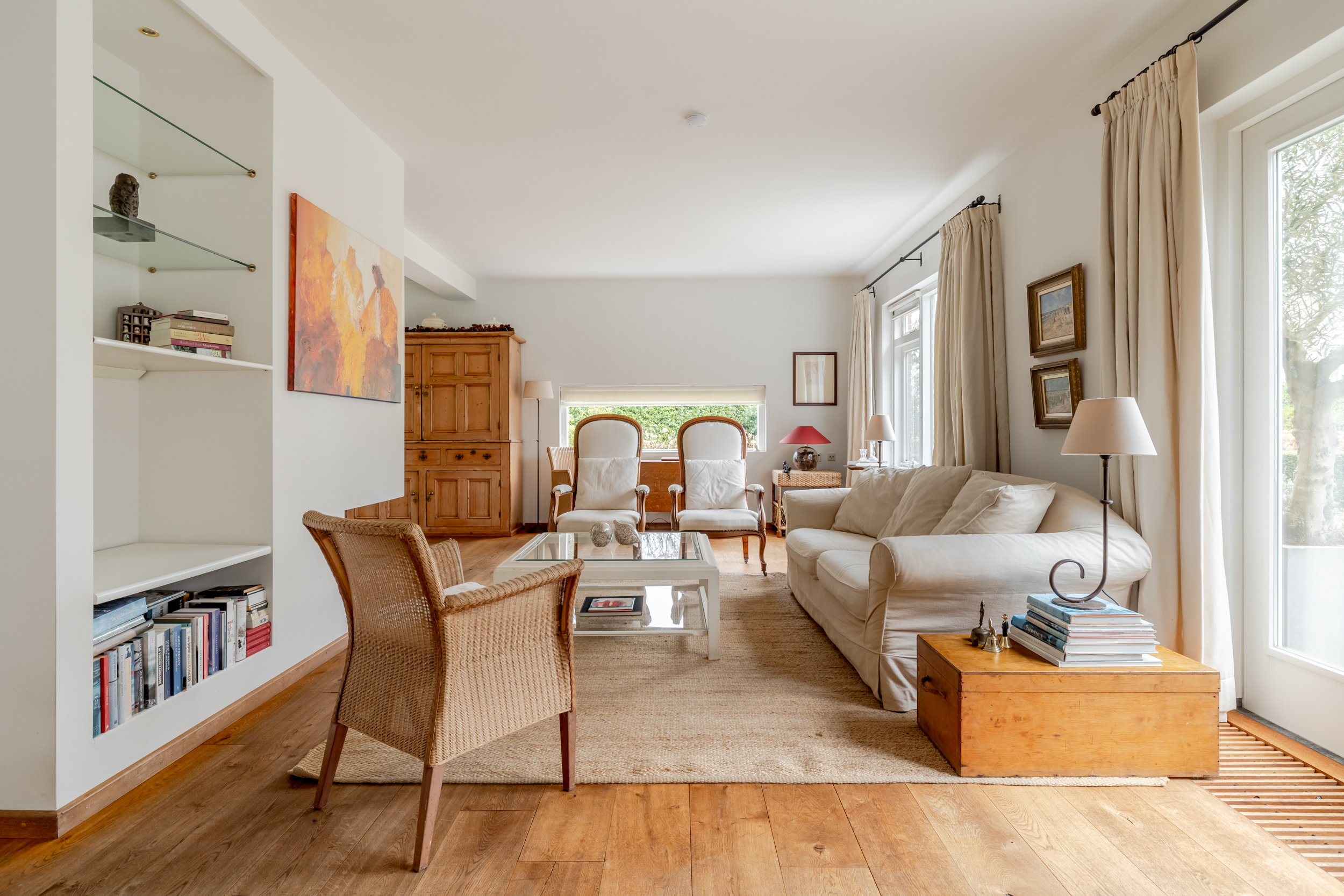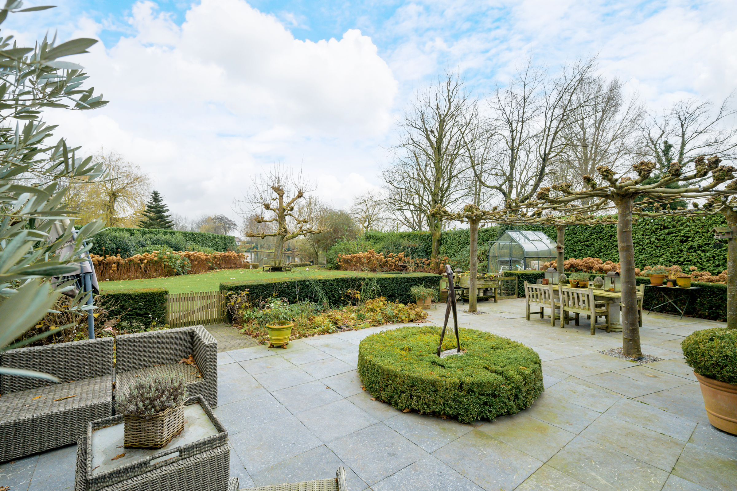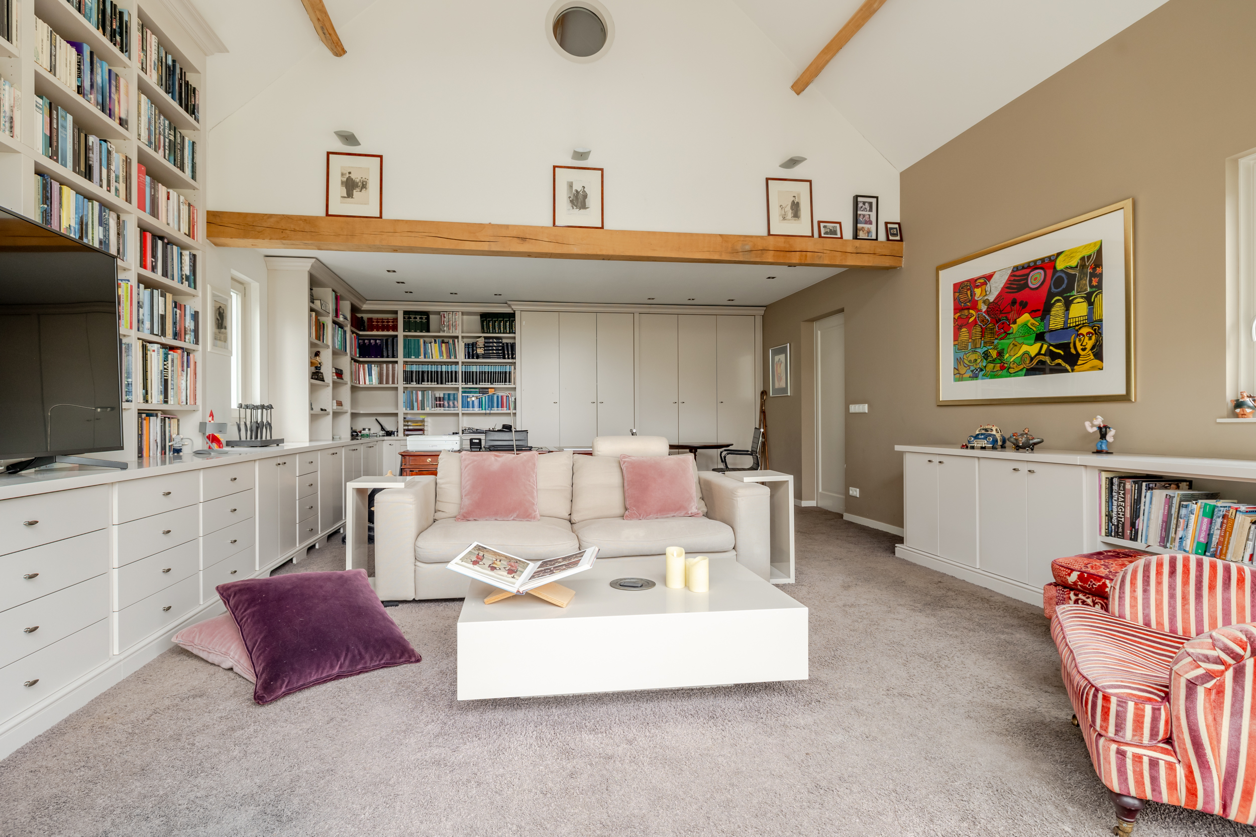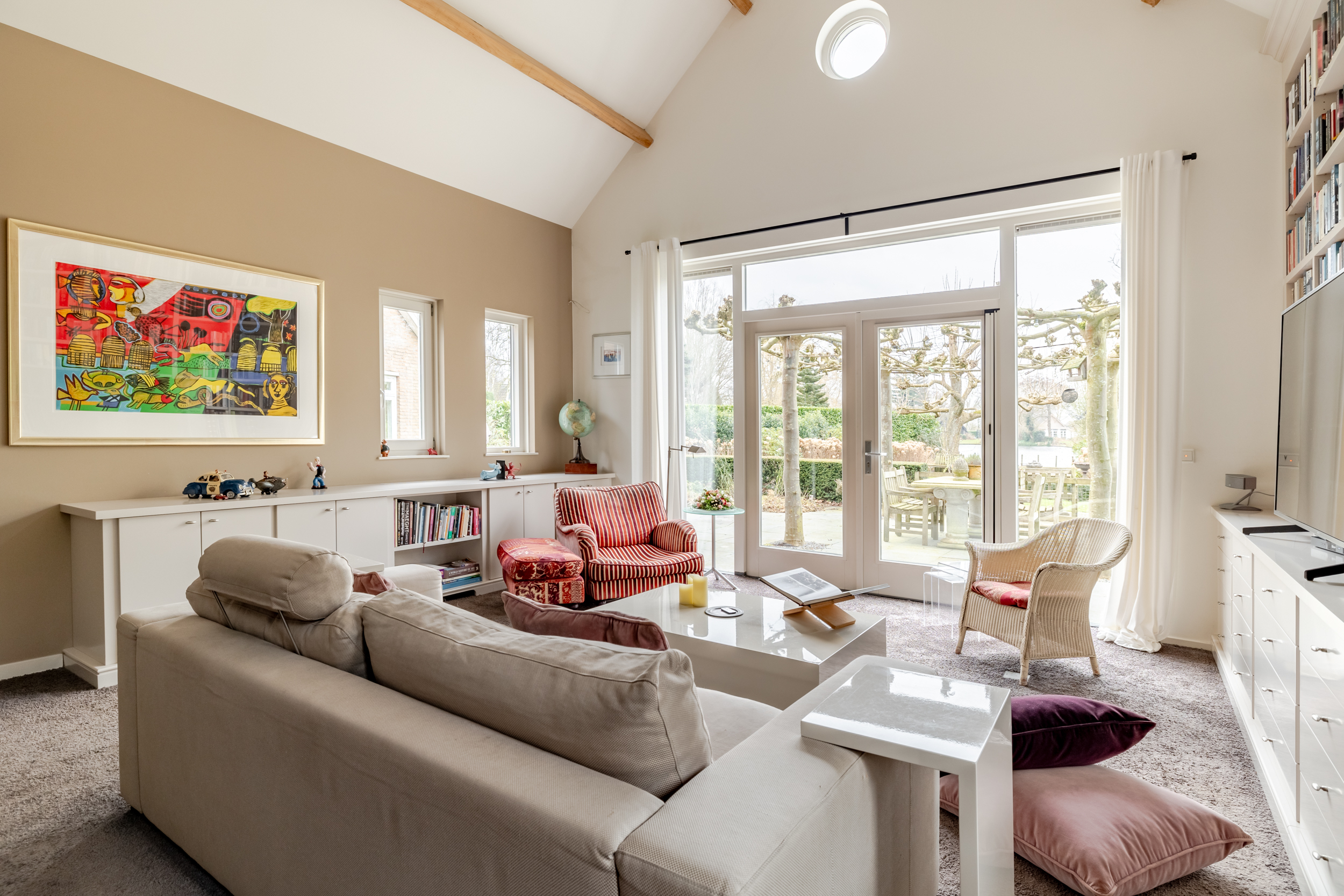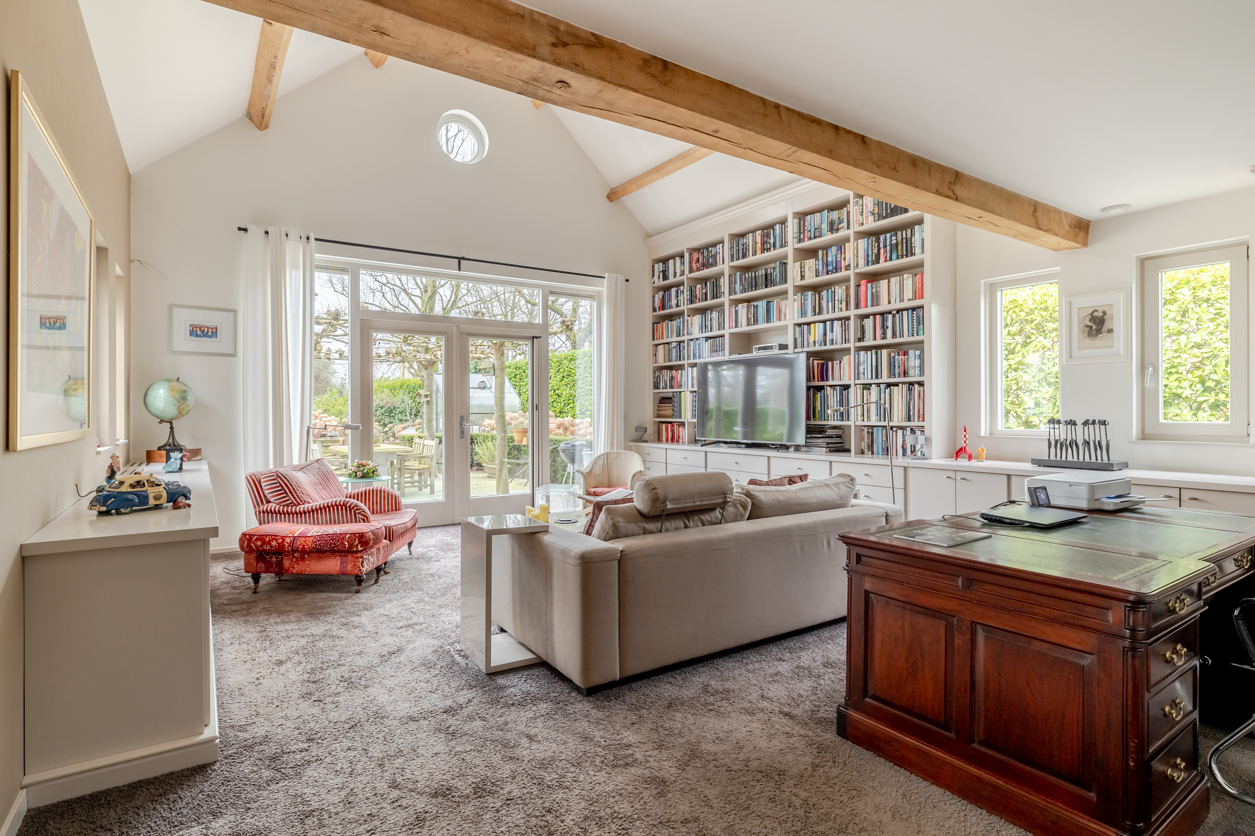 花园朝向的客厅是日常生活的核心,宽大的法式门和落地窗将自然光引入室内,庭院景观和水岸与起居空间无缝相连。约42 m²的宽阔办公室或工作室位于2008年扩建部分,配备定制储物柜,挑高5.4米的天花板和直通静谧花园露台的设计,带来极致的空间感。独立入口的这一侧翼同样适合用作办公、待客或护理用途。