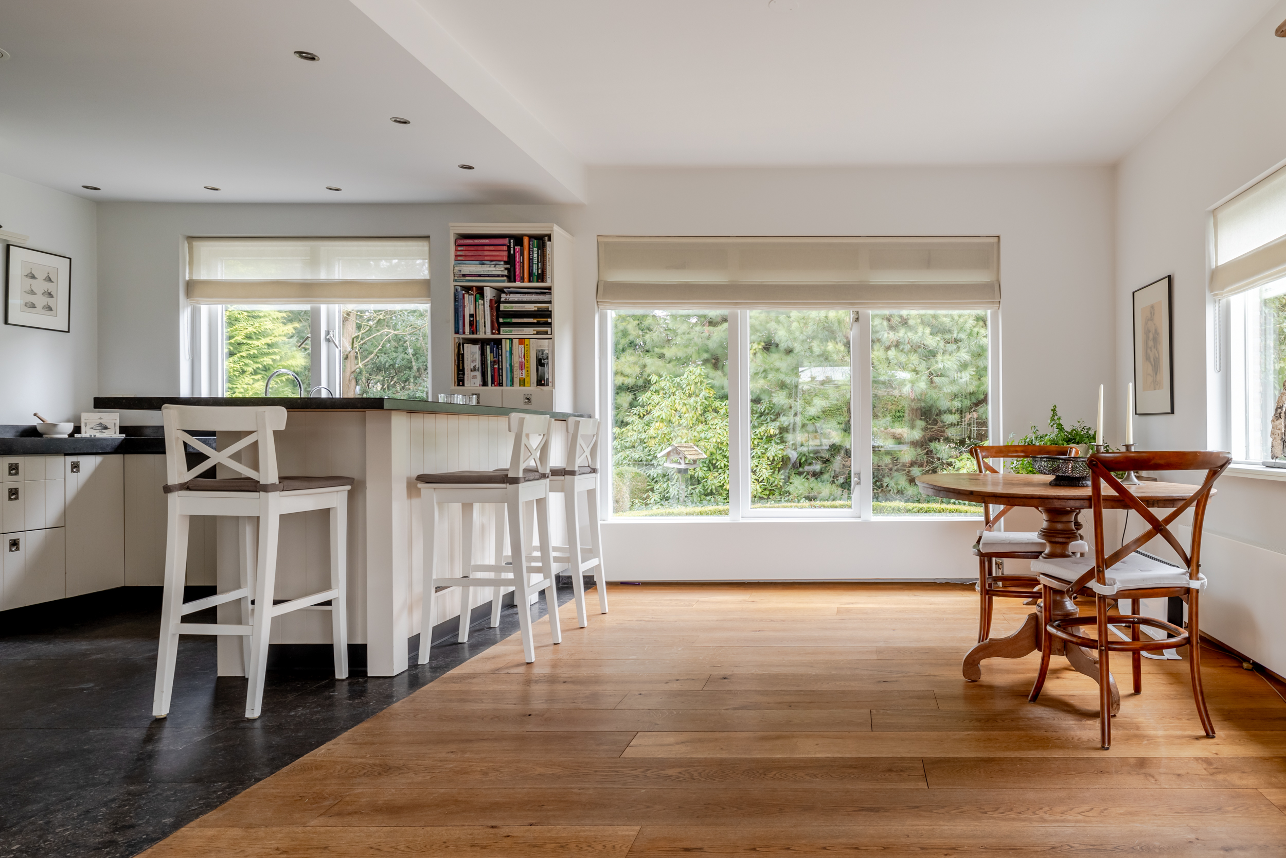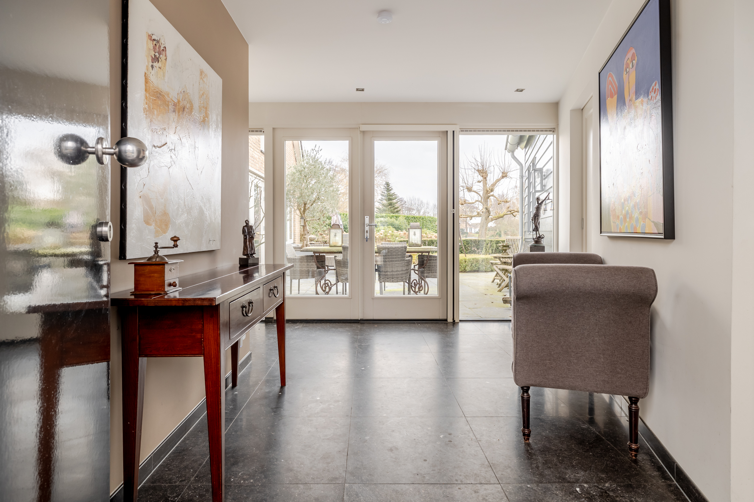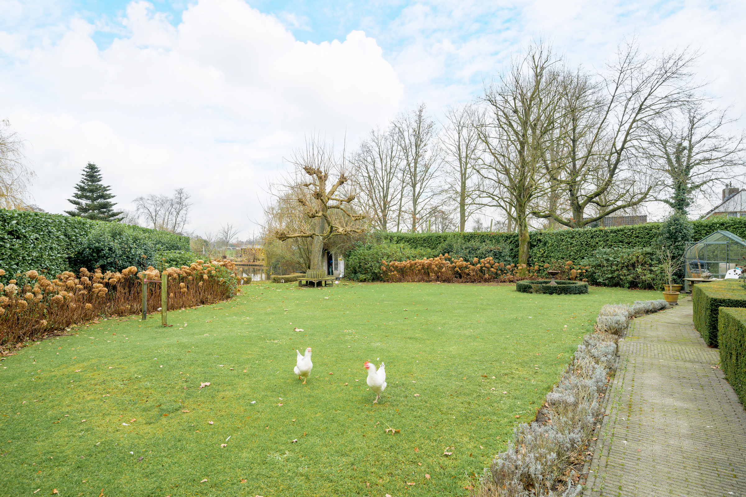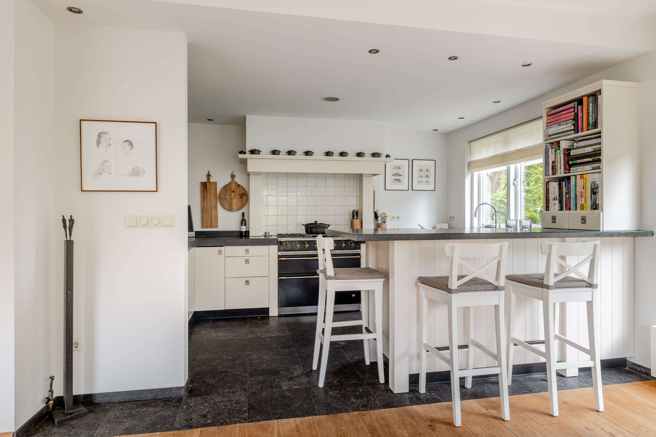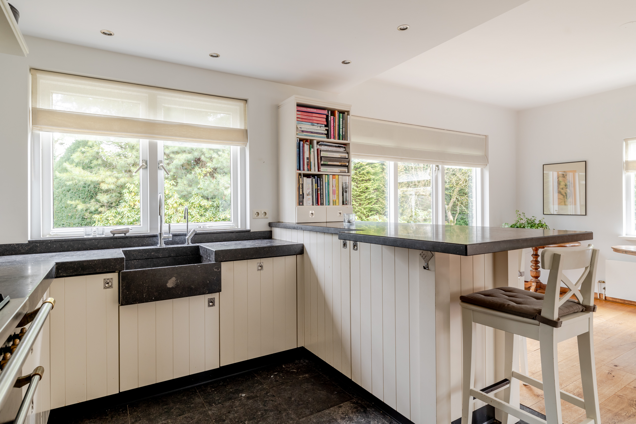 花园朝向的客厅是日常生活的核心,宽大的法式门和落地窗将自然光引入室内,庭院景观和水岸与起居空间无缝相连。约42 m²的宽阔办公室或工作室位于2008年扩建部分,配备定制储物柜,挑高5.4米的天花板和直通静谧花园露台的设计,带来极致的空间感。独立入口的这一侧翼同样适合用作办公、待客或护理用途。