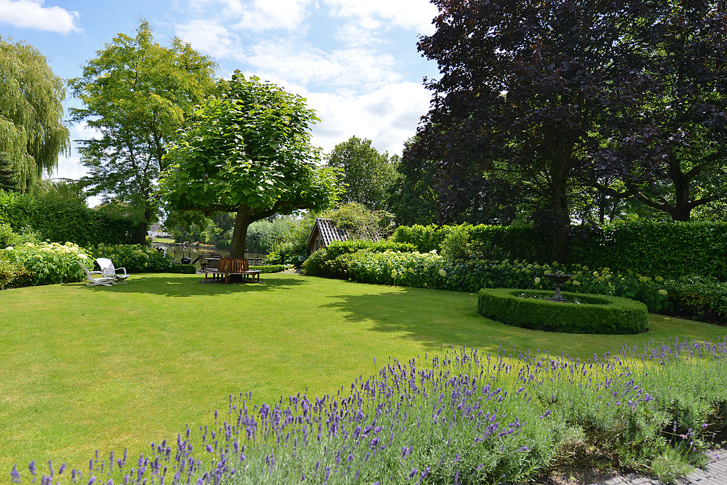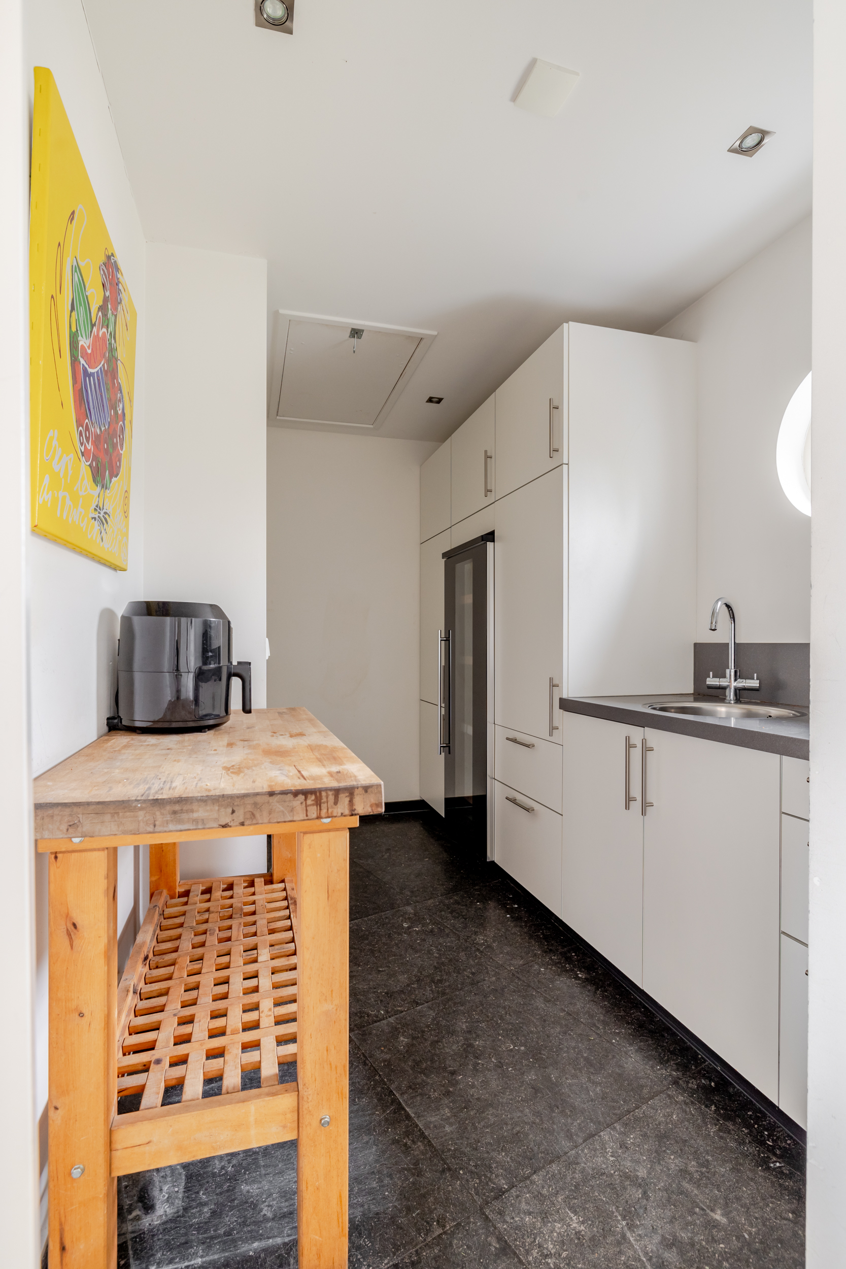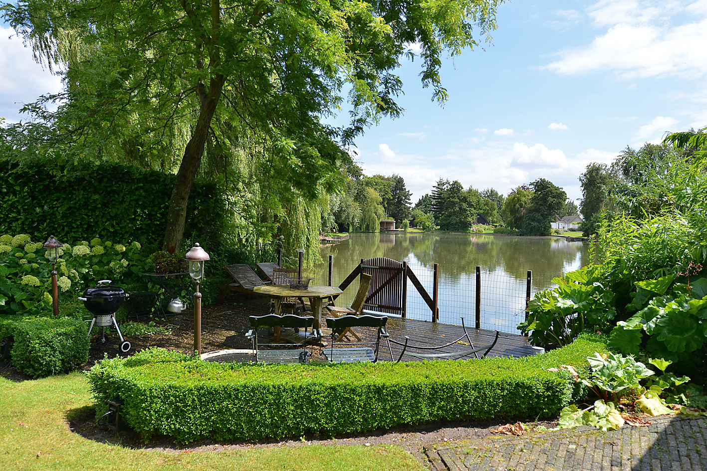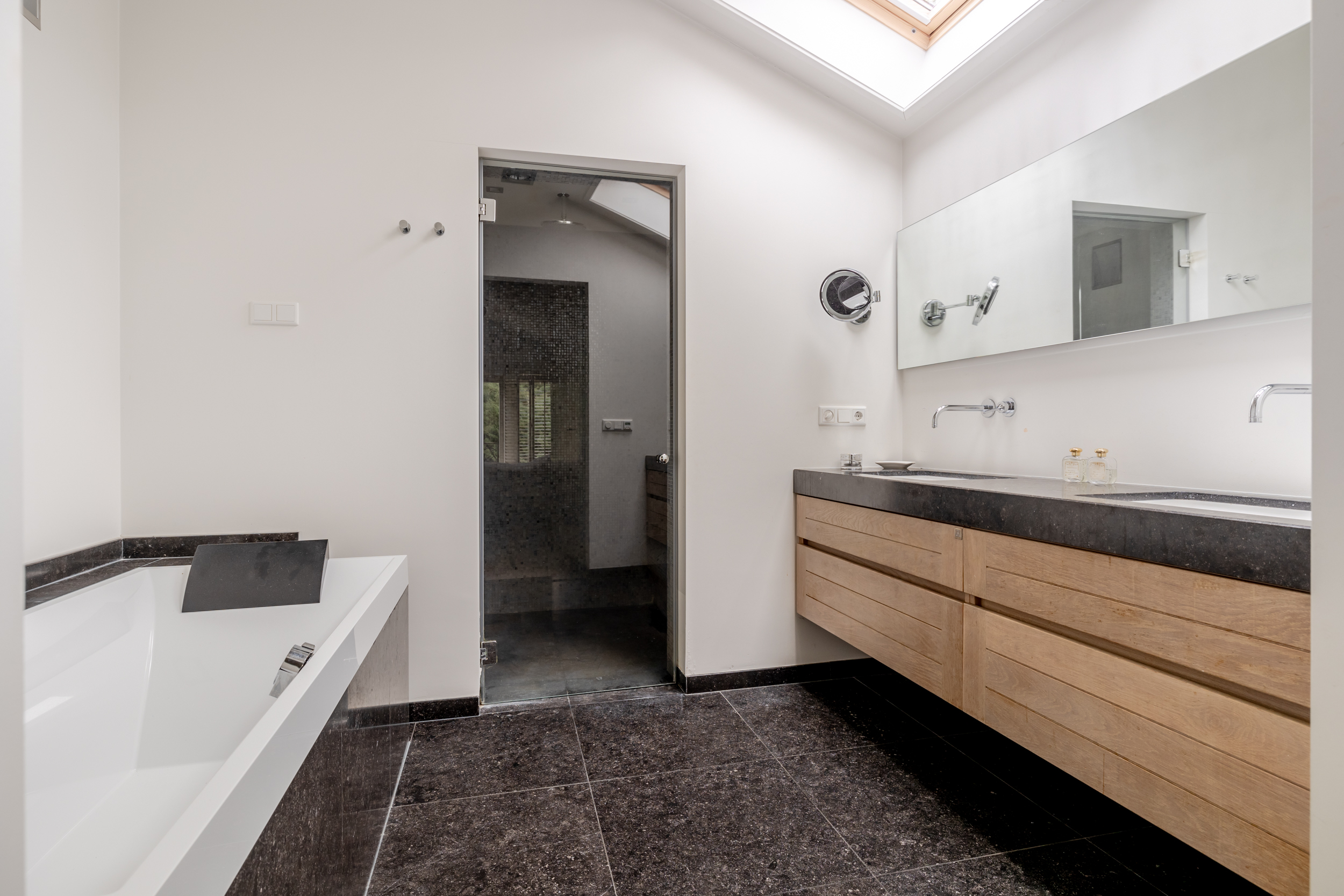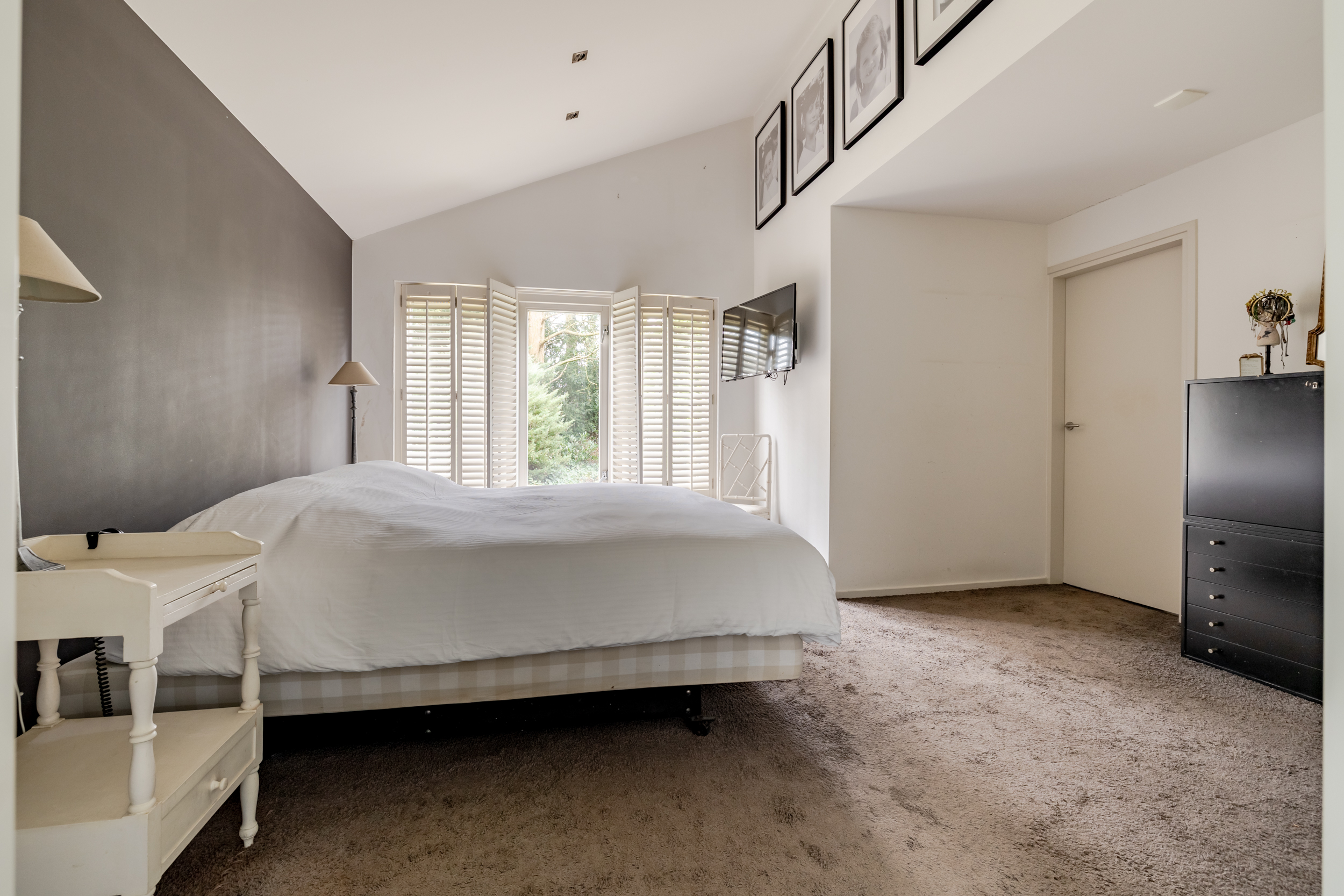 花园朝向的客厅是日常生活的核心,宽大的法式门和落地窗将自然光引入室内,庭院景观和水岸与起居空间无缝相连。约42 m²的宽阔办公室或工作室位于2008年扩建部分,配备定制储物柜,挑高5.4米的天花板和直通静谧花园露台的设计,带来极致的空间感。独立入口的这一侧翼同样适合用作办公、待客或护理用途。