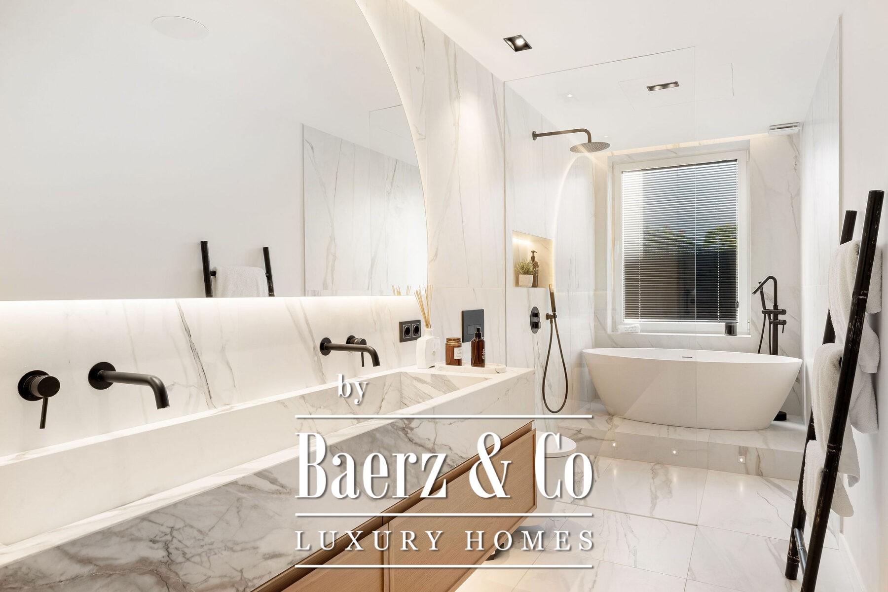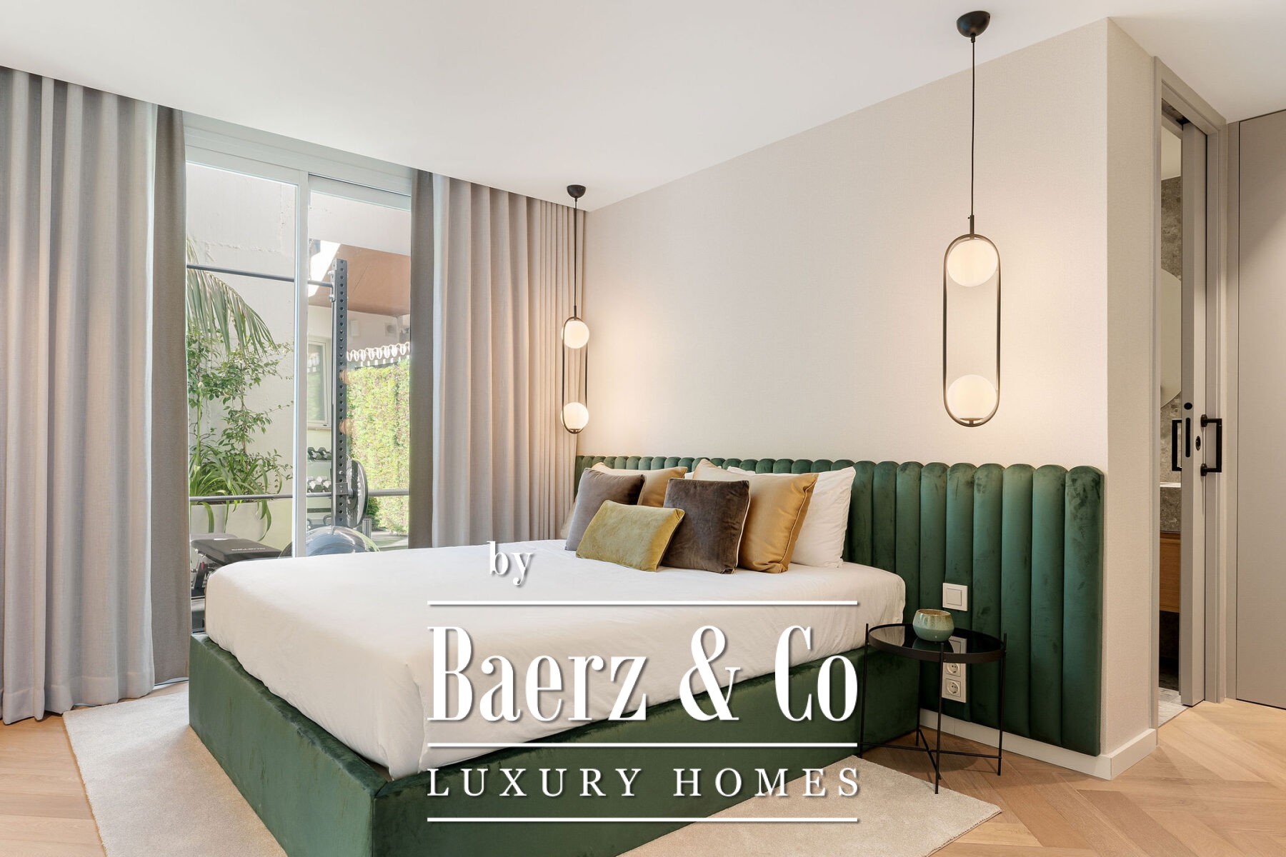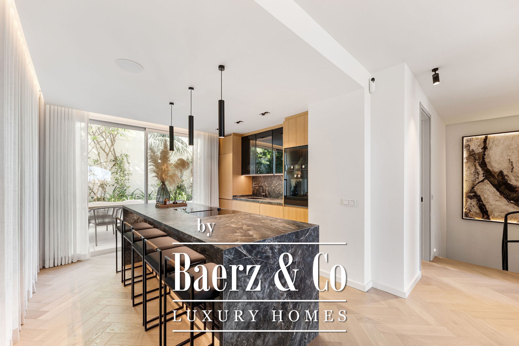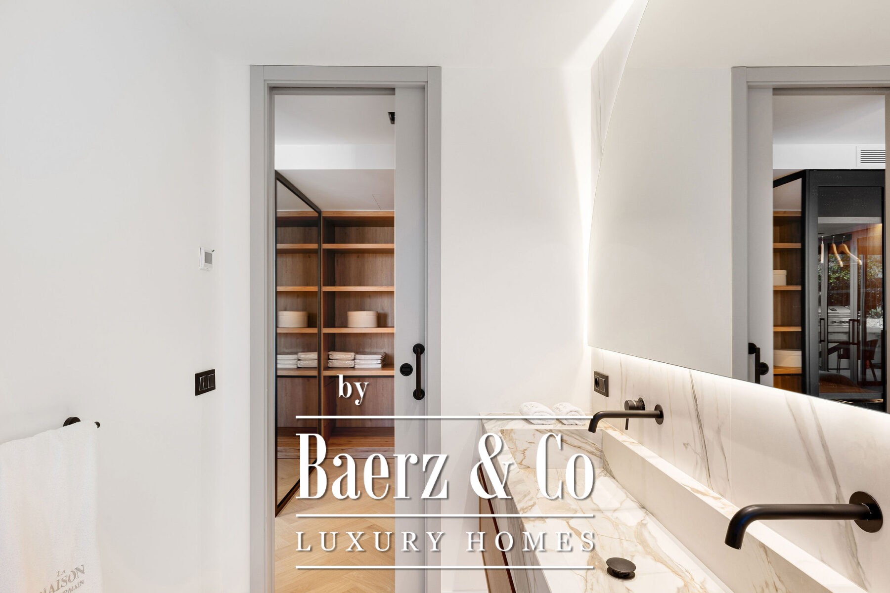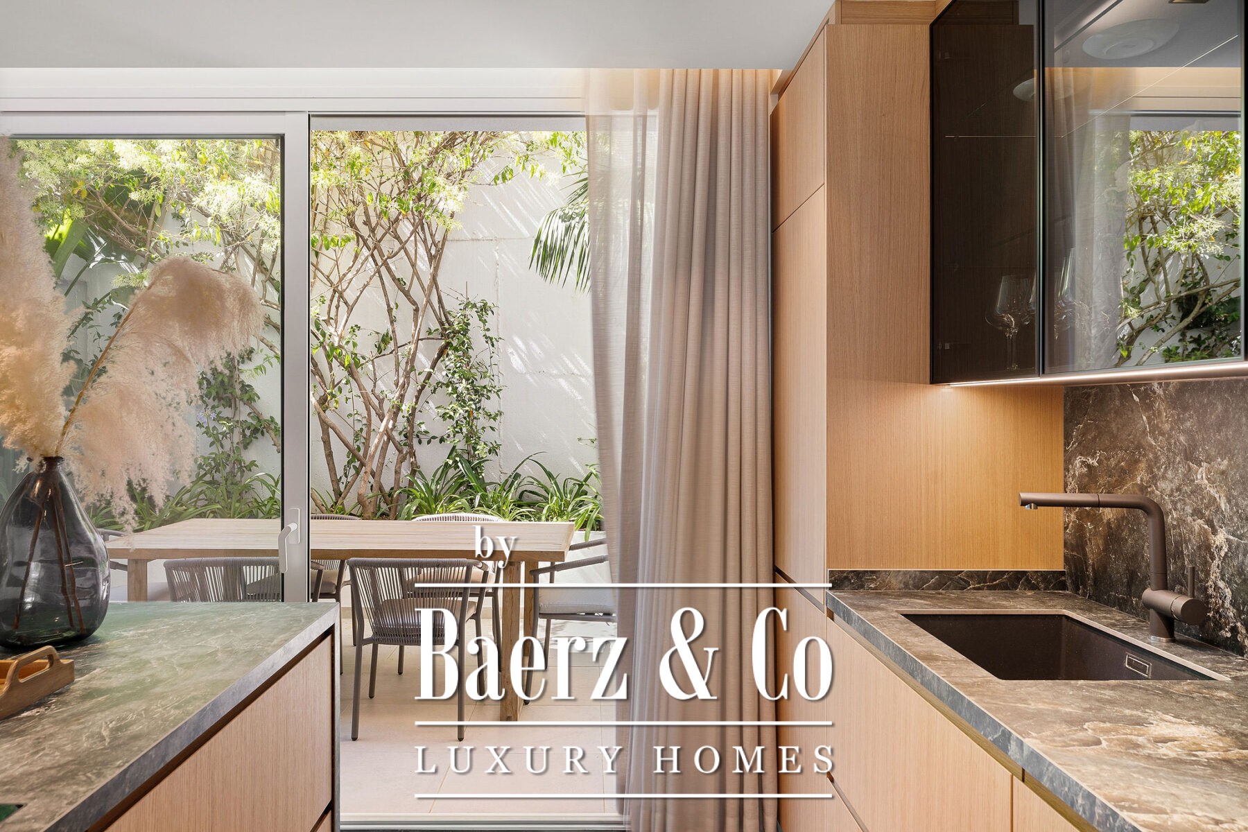 一层空间设计通透,阳光自然洒满开放式客厅、餐区及配备顶级 Gaggenau 电器的厨房,每个细节均选用珍贵木材与大理石饰面。人字拼地板与自然色调,营造温暖而内敛的格调。客厅延伸至私家庭院,适合户外聚餐及静谧休憩。主卧套房富丽堂皇,拥有宽敞衣帽间、独立浴缸(面朝露台)及专属卫浴。楼层另设一间卧室,可灵活满足家庭或客人的住宿需求。