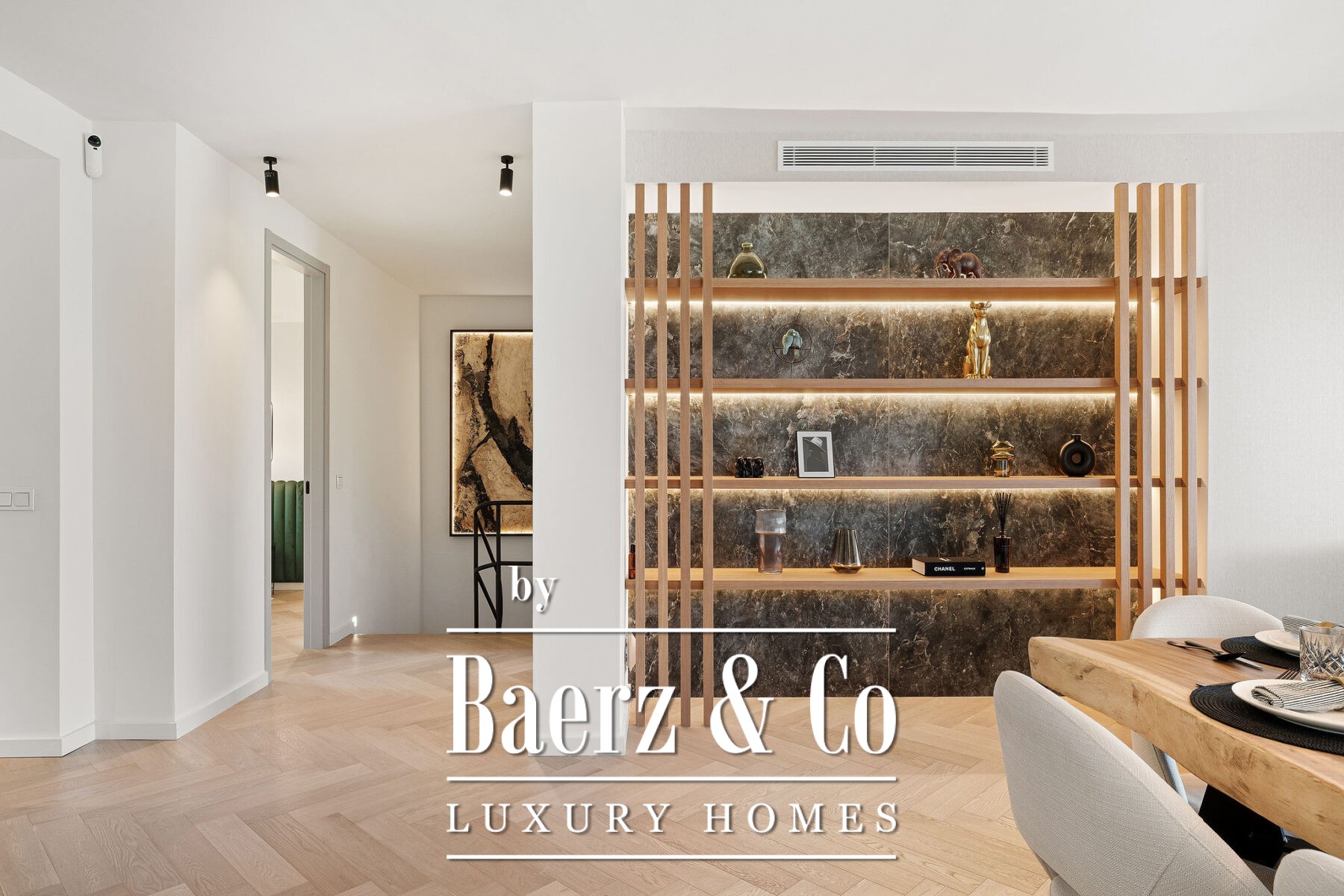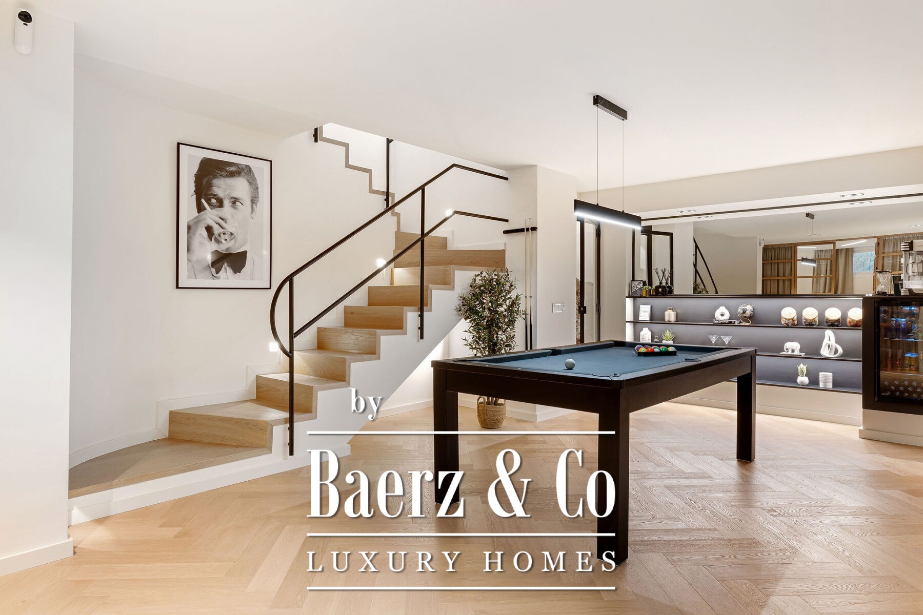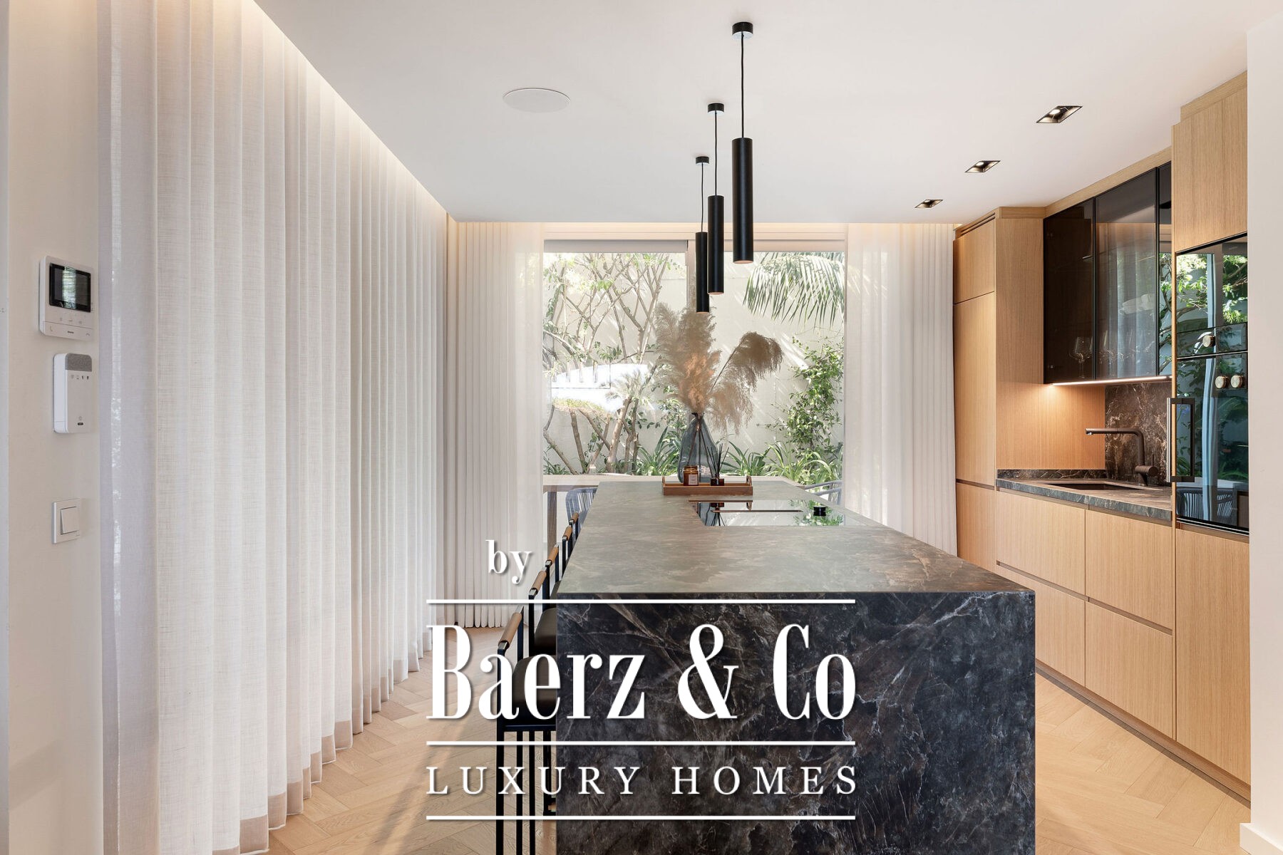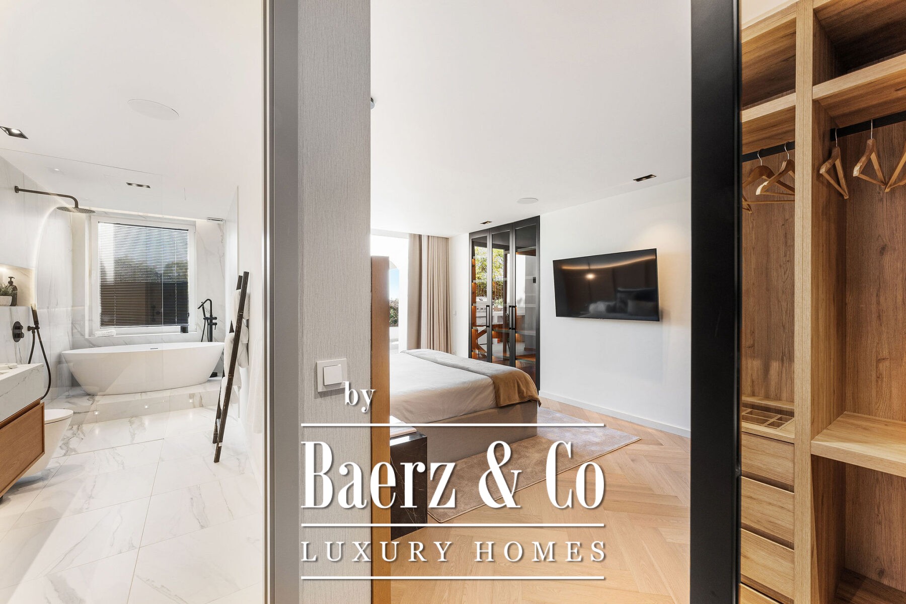 一层空间设计通透,阳光自然洒满开放式客厅、餐区及配备顶级 Gaggenau 电器的厨房,每个细节均选用珍贵木材与大理石饰面。人字拼地板与自然色调,营造温暖而内敛的格调。客厅延伸至私家庭院,适合户外聚餐及静谧休憩。主卧套房富丽堂皇,拥有宽敞衣帽间、独立浴缸(面朝露台)及专属卫浴。楼层另设一间卧室,可灵活满足家庭或客人的住宿需求。