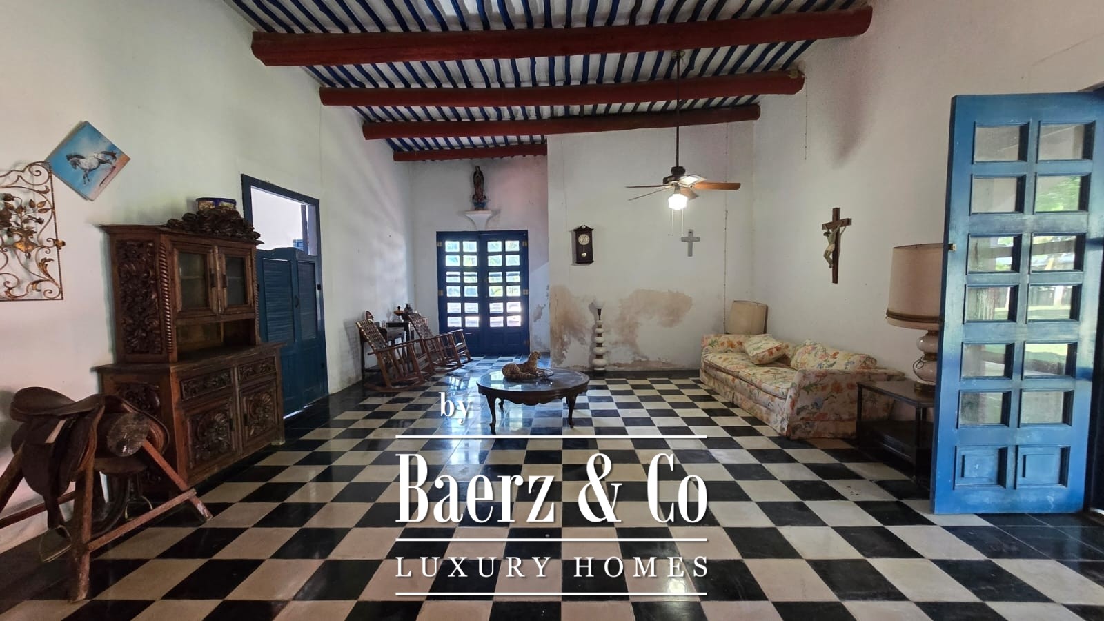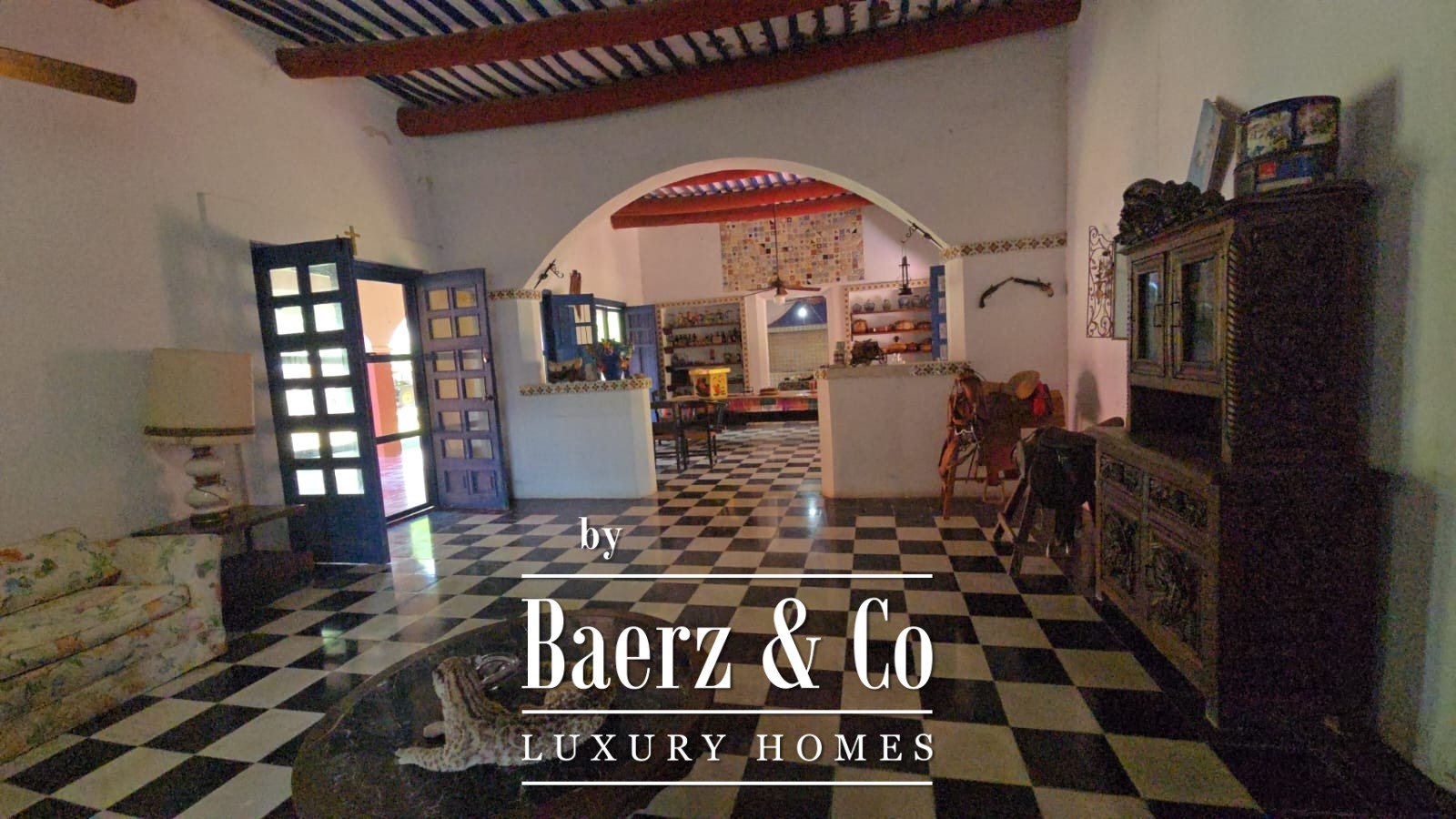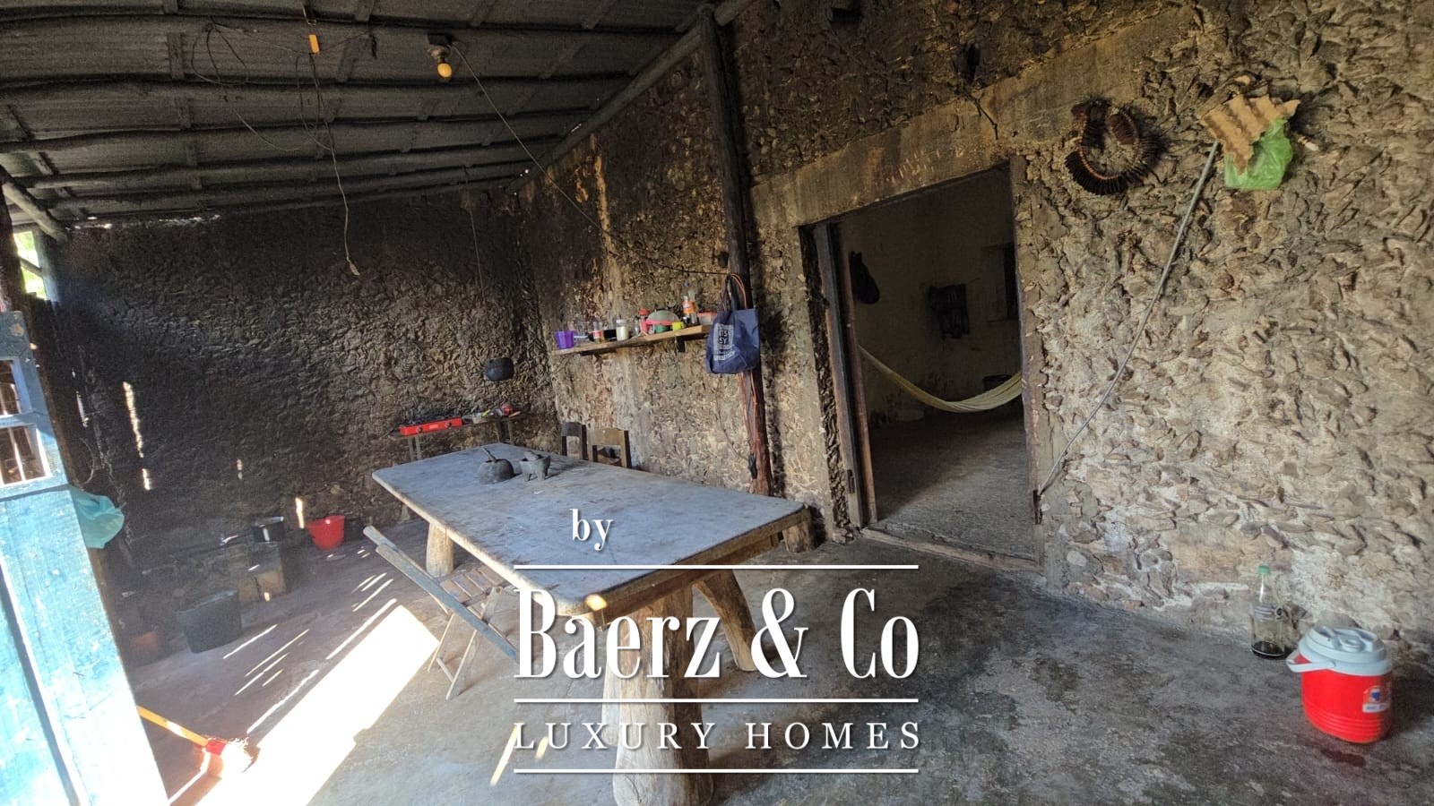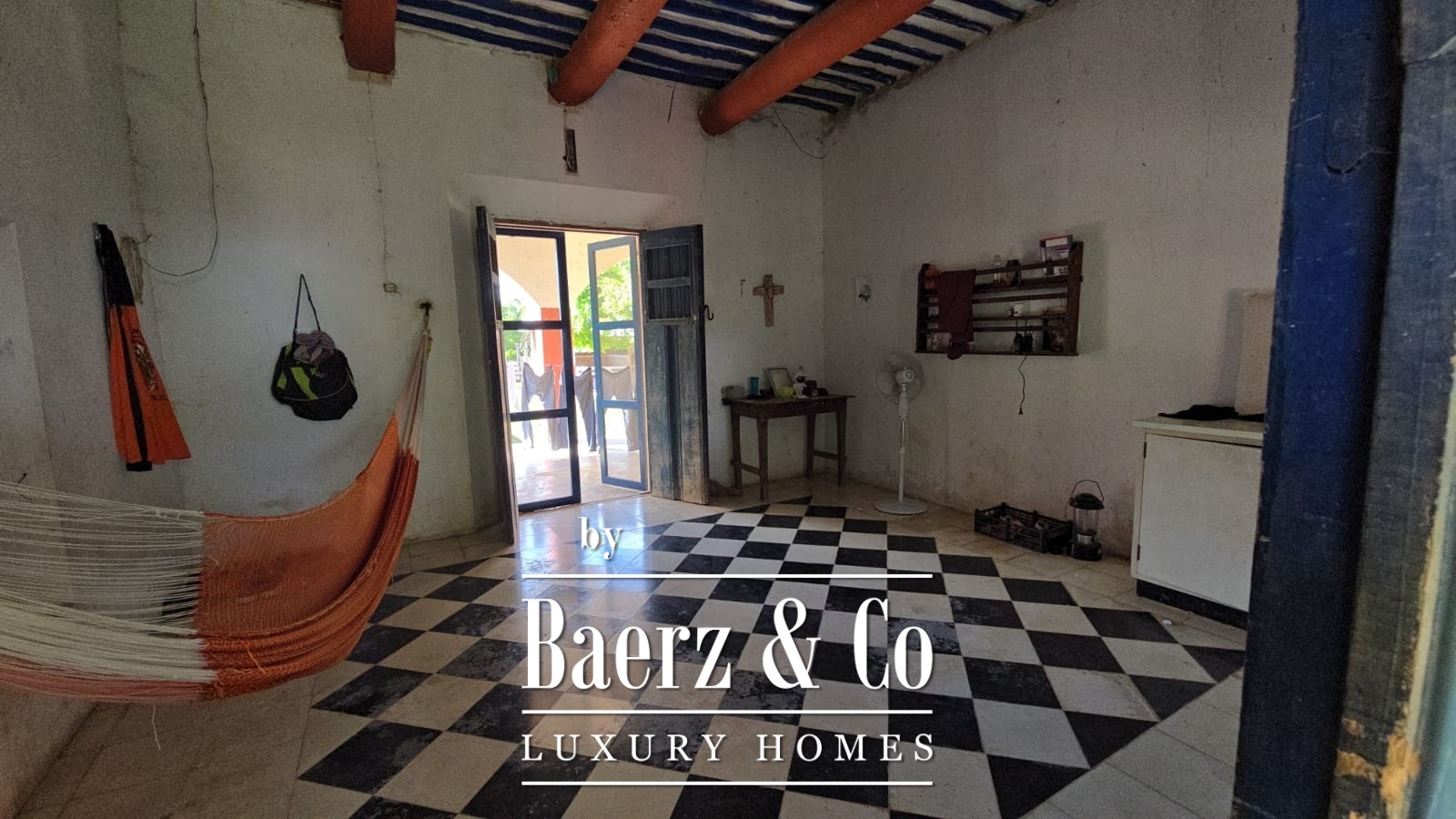The residential area comprises approximately 650 square meters of buildings. The main hacienda-style house offers a spacious living and dining room, a kitchen with a coal fireplace, gas stove and refrigerator, a master bedroom, two additional rooms, and a full bathroom.