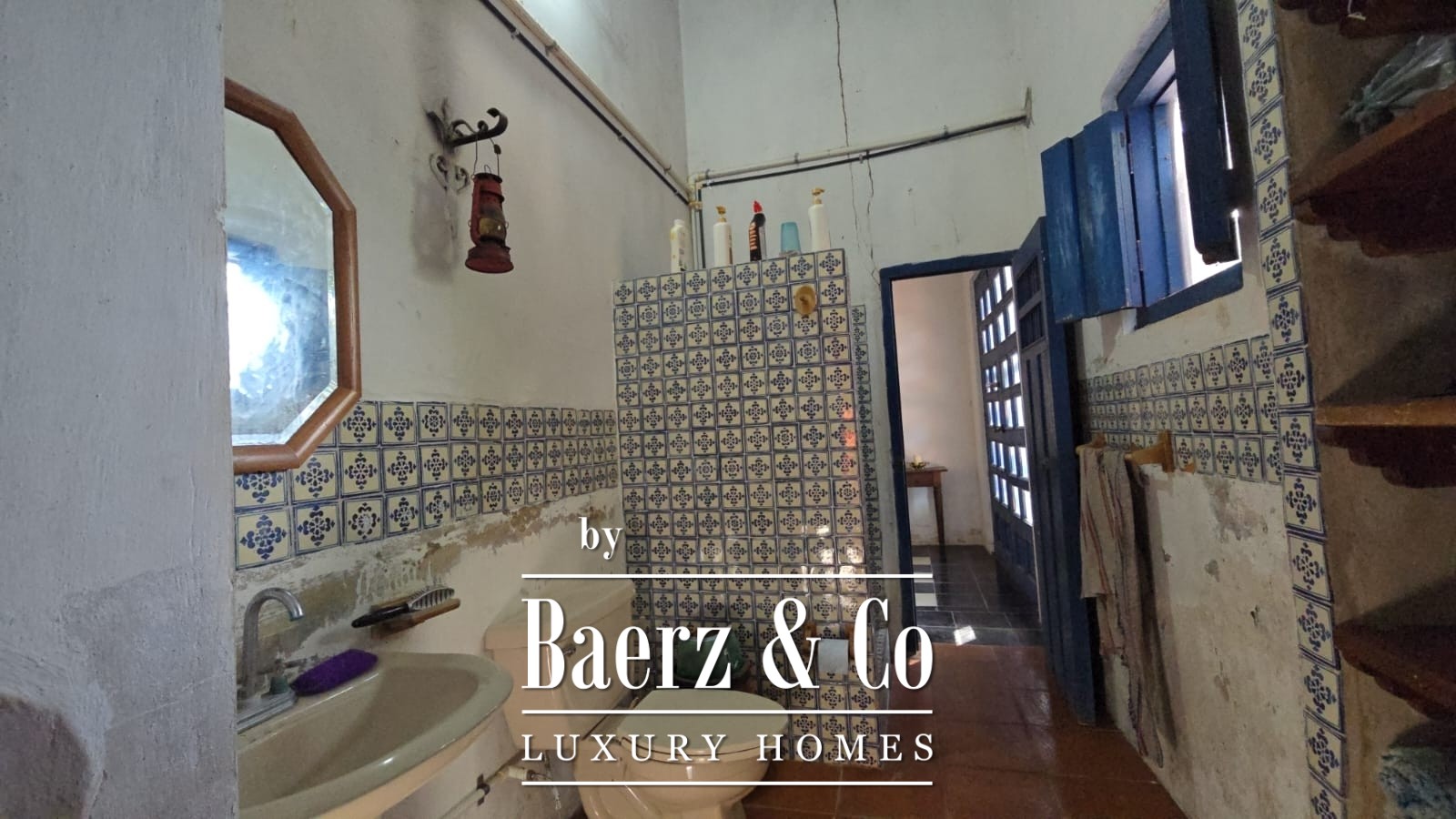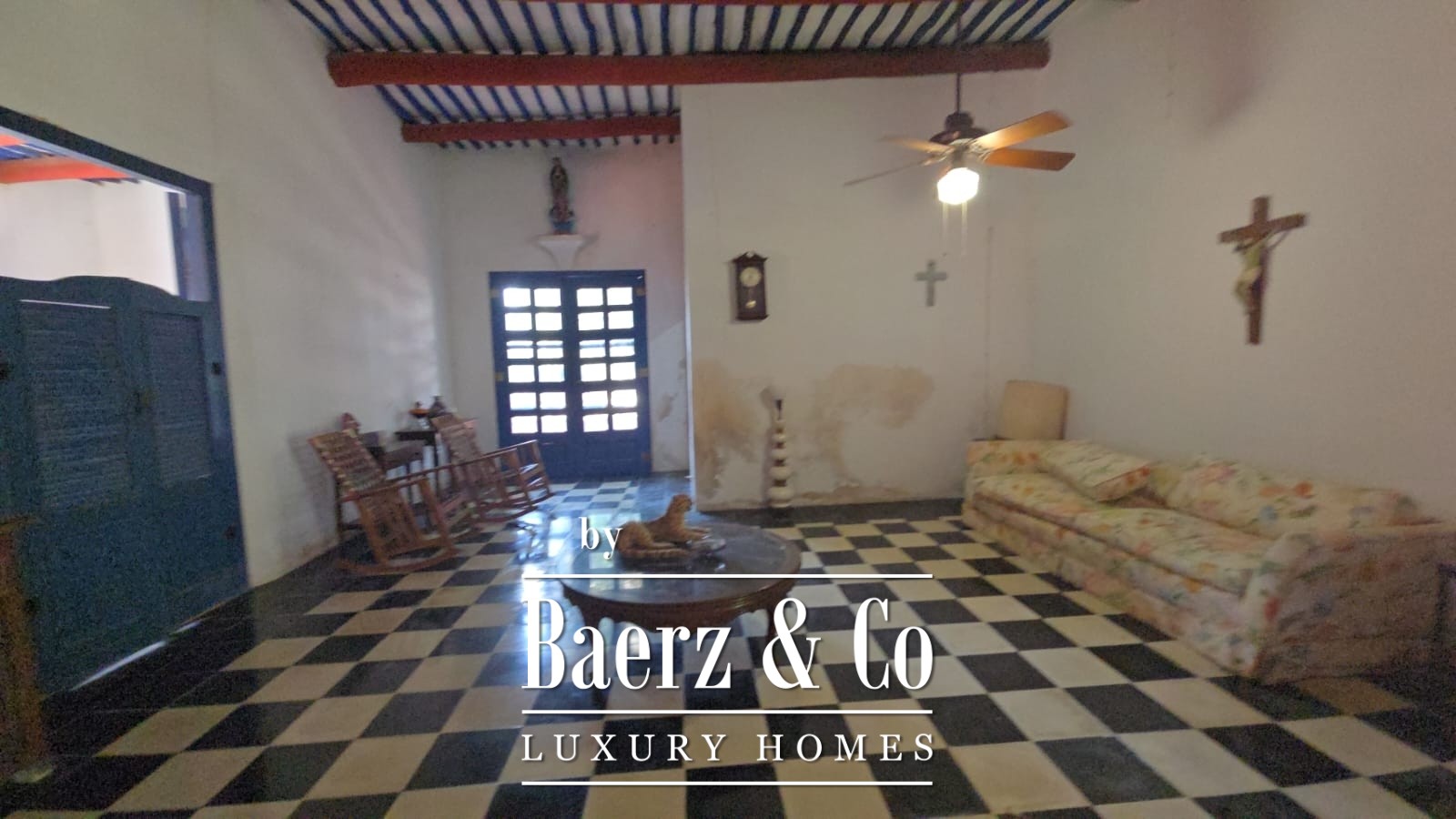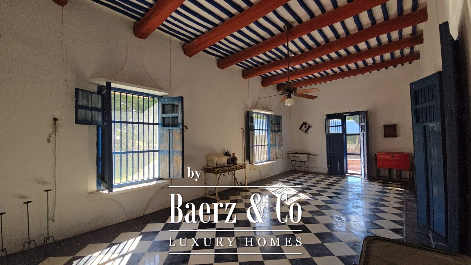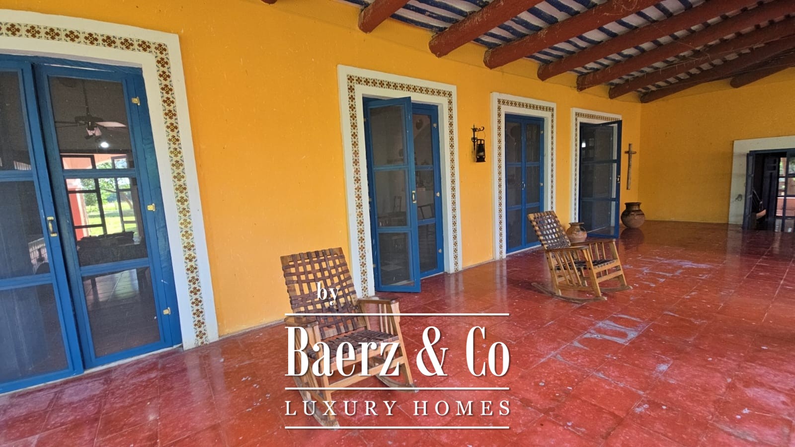 The residential area comprises approximately 650 square meters of buildings. The main hacienda-style house offers a spacious living and dining room, a kitchen with a coal fireplace, gas stove and refrigerator, a master bedroom, two additional rooms, and a full bathroom.