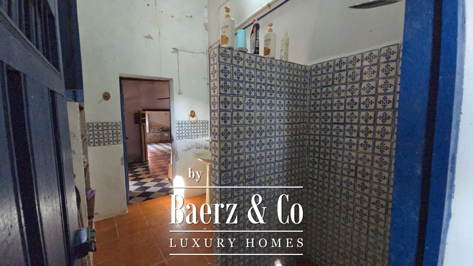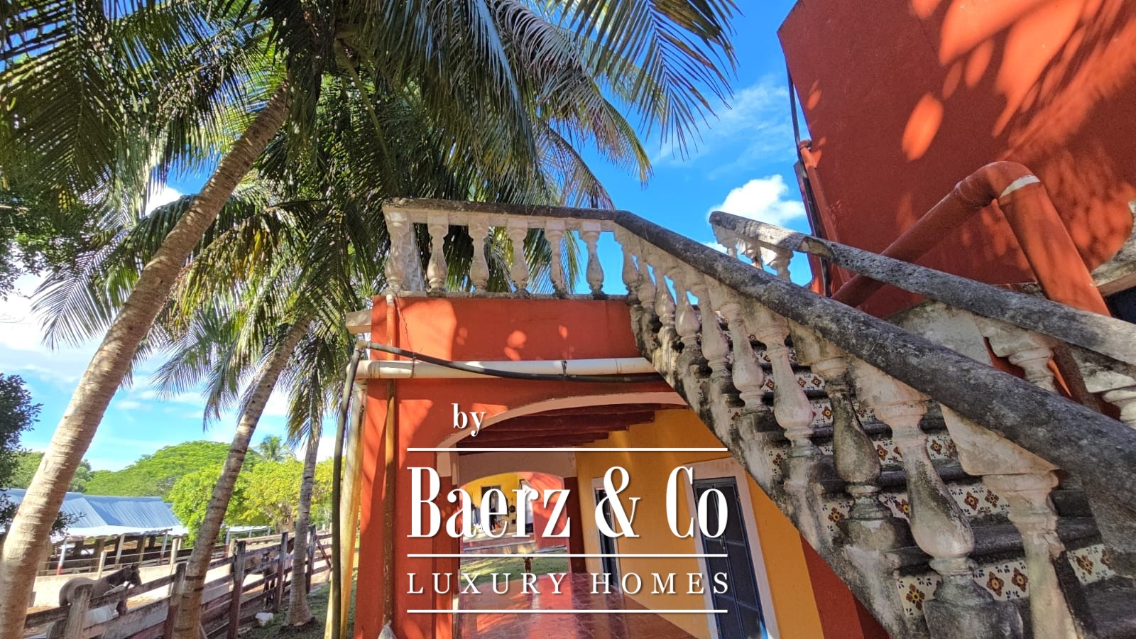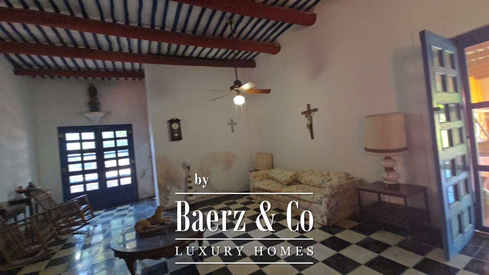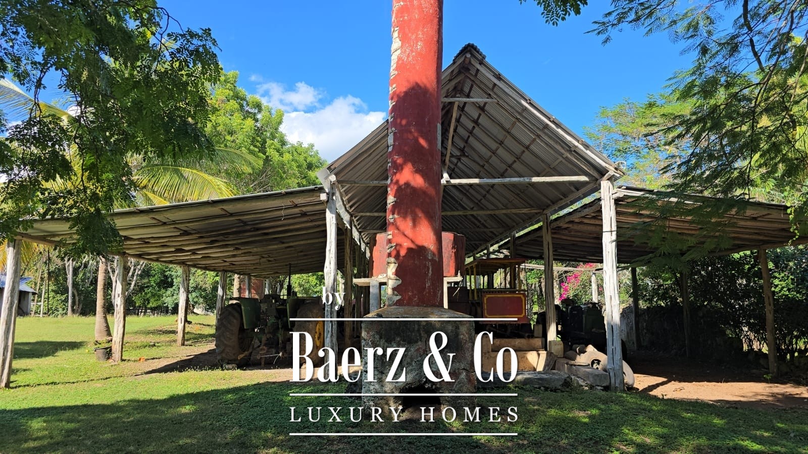 The residential area comprises approximately 650 square meters of buildings. The main hacienda-style house offers a spacious living and dining room, a kitchen with a coal fireplace, gas stove and refrigerator, a master bedroom, two additional rooms, and a full bathroom.